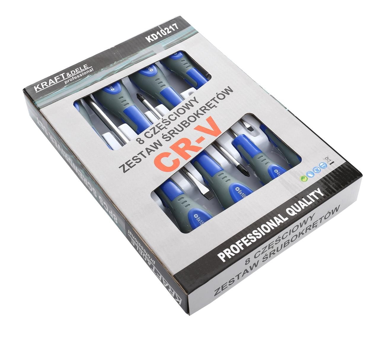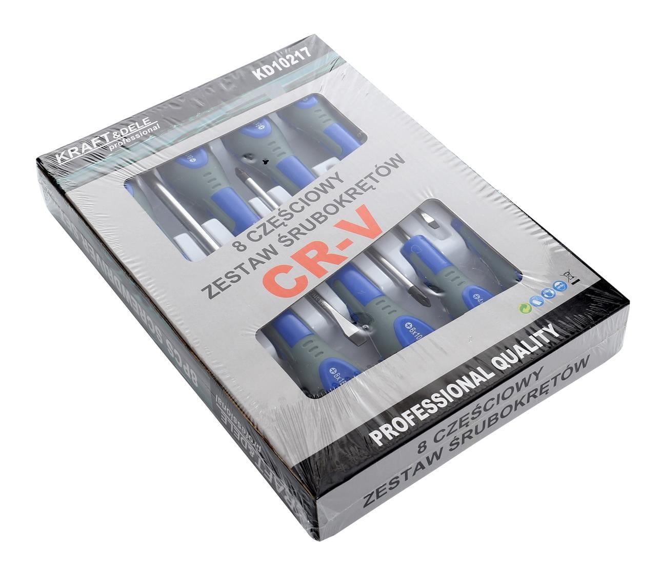 KD10217 to kompletny zestaw ośmiu wkrętaków obejmujący trzy typy grotów: płaskie (SL), krzyżowe Phillips (PH) oraz Pozidriv (PZ). Narzędzia wykonano ze stali chromowo-wanadowej z namagnesowanymi, piaskowanymi grotami i ergonomiczną rękojeścią z gumową powłoką.