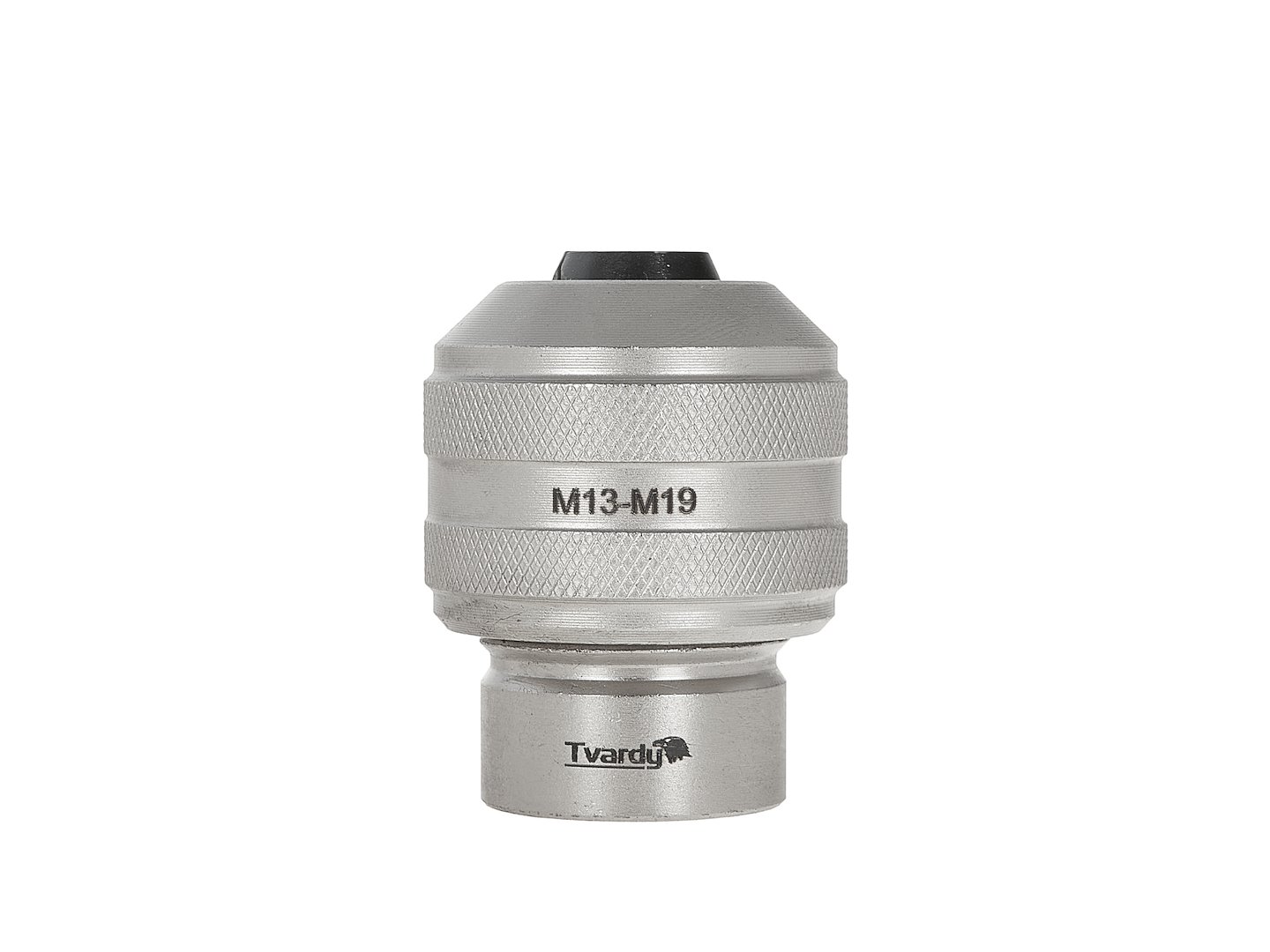 Adapter obejmuje siedem rozmiarów gwintowników: M13, M14, M15, M16, M17, M18 i M19. Precyzyjne dopasowanie gniazda eliminuje luz osiowy i poprzeczny, co bezpośrednio wpływa na jakość wykonanego gwintu i zmniejsza ryzyko złamania gwintownika.