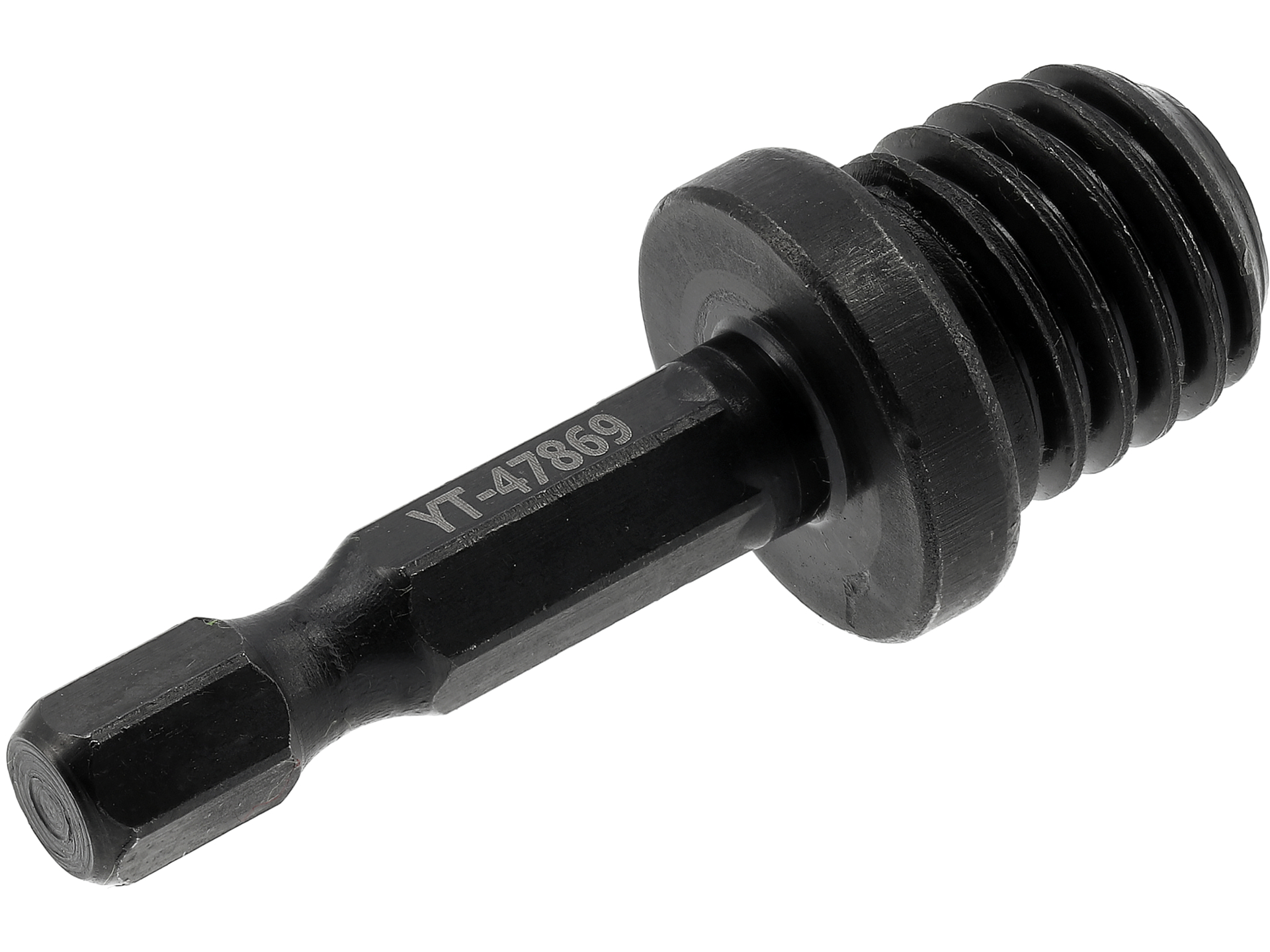 Adapter przejściowy umożliwiający montaż akcesoriów z gwintem M14 w wiertarkach i szlifierkach prostych z uchwytem sześciokątnym 1/4". Wykonany ze stali węglowej z czernioną powłoką antykorozyjną.