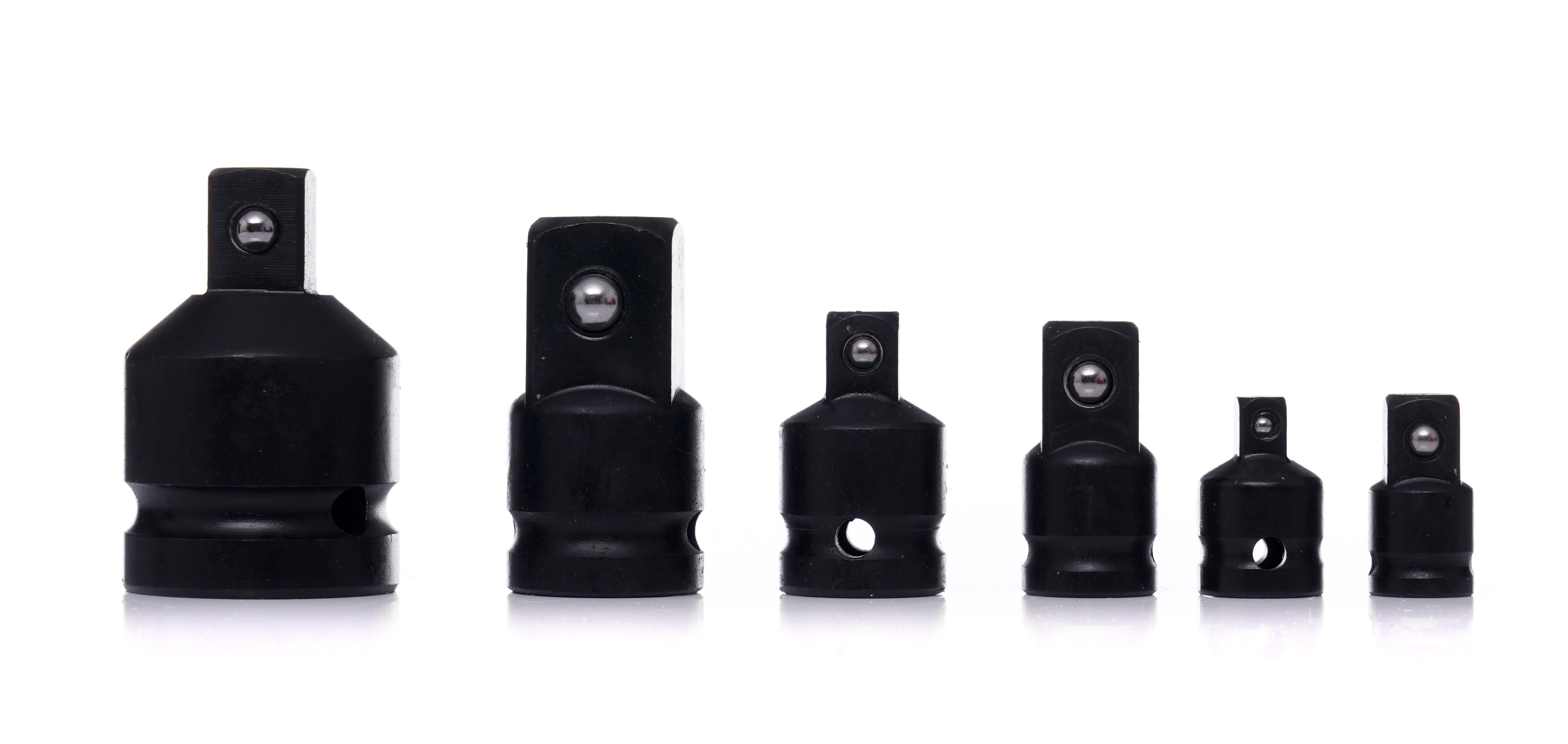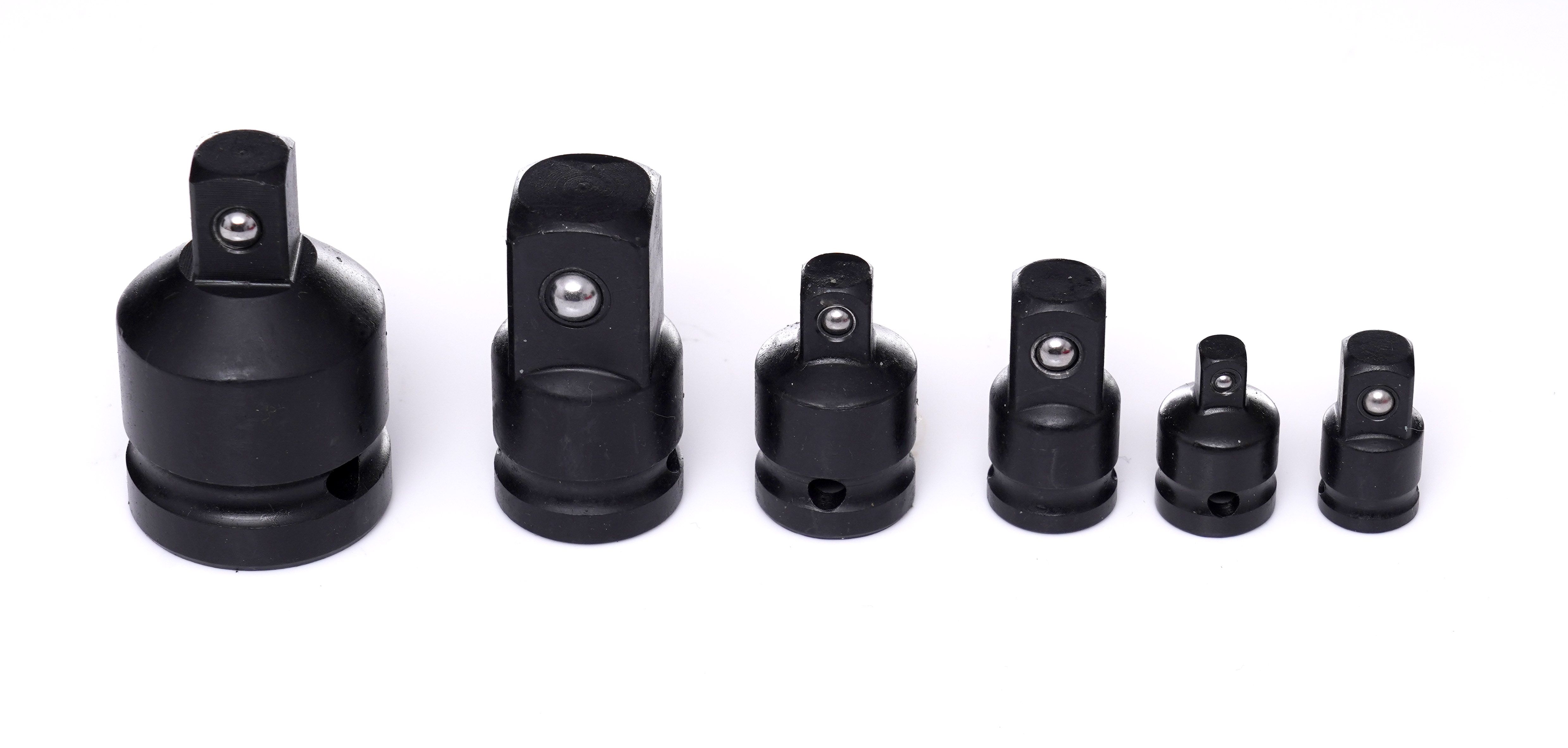 Zestaw adapterów redukcyjnych udarowych obejmuje popularne przejścia między 1/4", 3/8", 1/2" i 3/4", co ułatwia pracę na jednym kluczu udarowym.