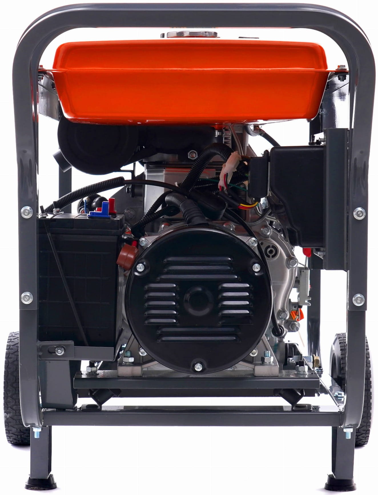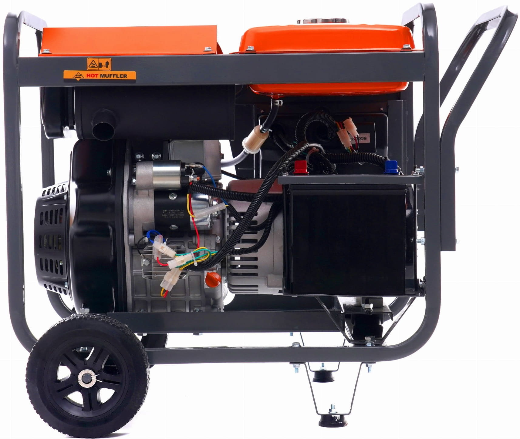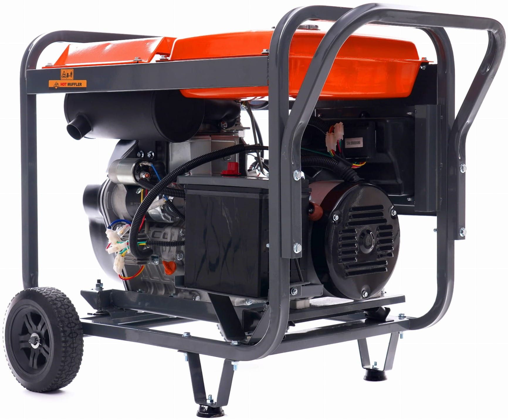 Silnik osadzony jest na gumowych poduszkach tłumiących drgania, co ogranicza przenoszenie wibracji na podłoże i otoczenie. Rama wyposażona w uchwyty i kółka transportowe umożliwia przemieszczanie agregatu o wadze 110 kg bez użycia wózka widłowego.