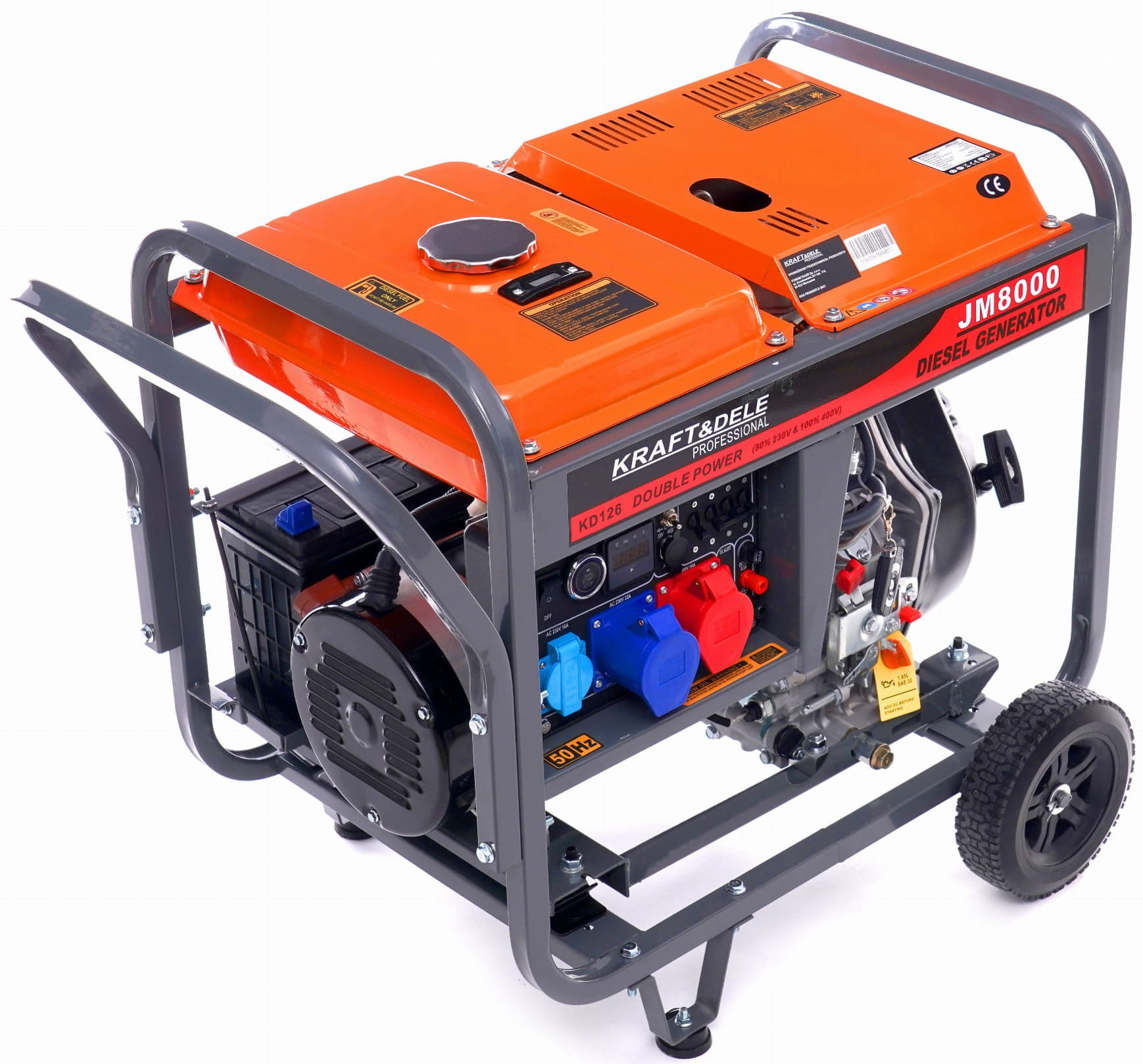 KD126 to trójfazowy agregat prądotwórczy zasilany olejem napędowym, przeznaczony do pracy ciągłej w warunkach przemysłowych i budowlanych. Urządzenie dysponuje mocą ciągłą 7000 W i maksymalną 8000 W, obsługuje jednocześnie napięcie jednofazowe 230 V oraz trójfazowe 400 V, a układ AVR z miedzianą prądnicą zapewnia stabilne parametry zasilania niezależnie od zmiennego obciążenia.