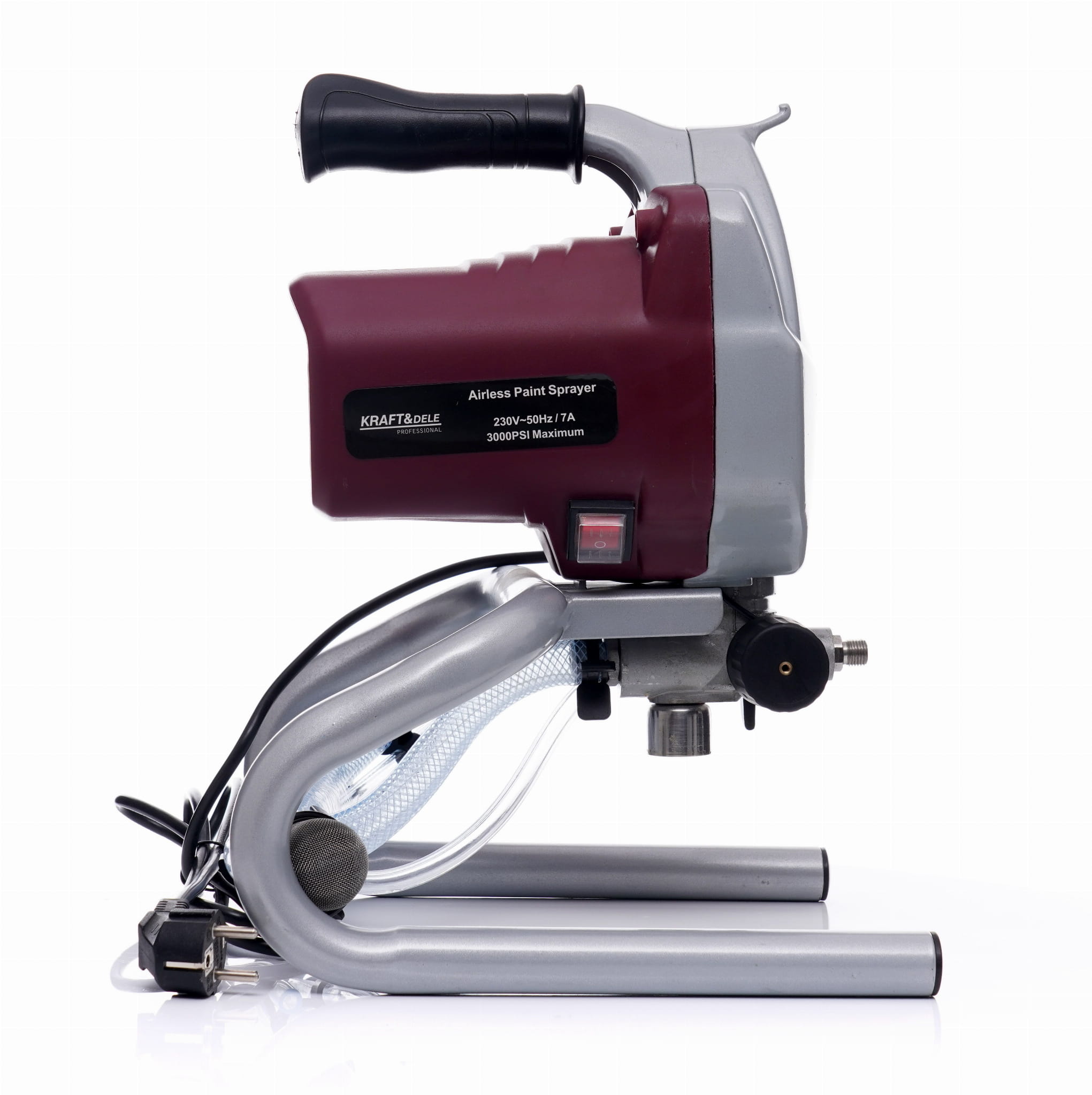 Elektryczny agregat natryskowy do bezpowietrznego malowania powierzchni budowlanych i przemysłowych. Urządzenie pracuje na zasadzie sprężenia farby pod wysokim ciśnieniem i jej natrysku bez udziału sprężonego powietrza, co przekłada się na równomierną warstwę powłoki i mniejsze straty materiału w porównaniu z metodami tradycyjnymi.