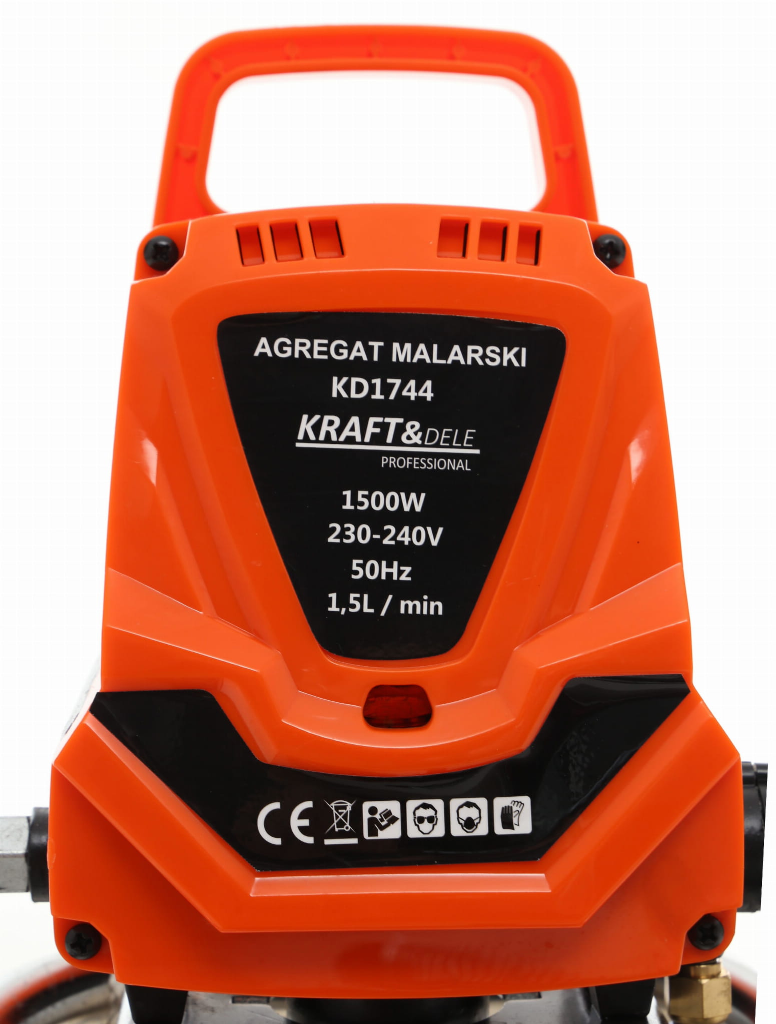 KD1744 to elektryczny agregat hydrodynamiczny z silnikiem 1500W, przeznaczony do natryskowego nakładania farb, lakierów i bejc na duże powierzchnie budowlane i przemysłowe. Pracuje metodą bezpowietrzną — farba jest sprężana tłokiem i podawana bezpośrednio na powierzchnię pod wysokim ciśnieniem, bez udziału sprężonego powietrza.