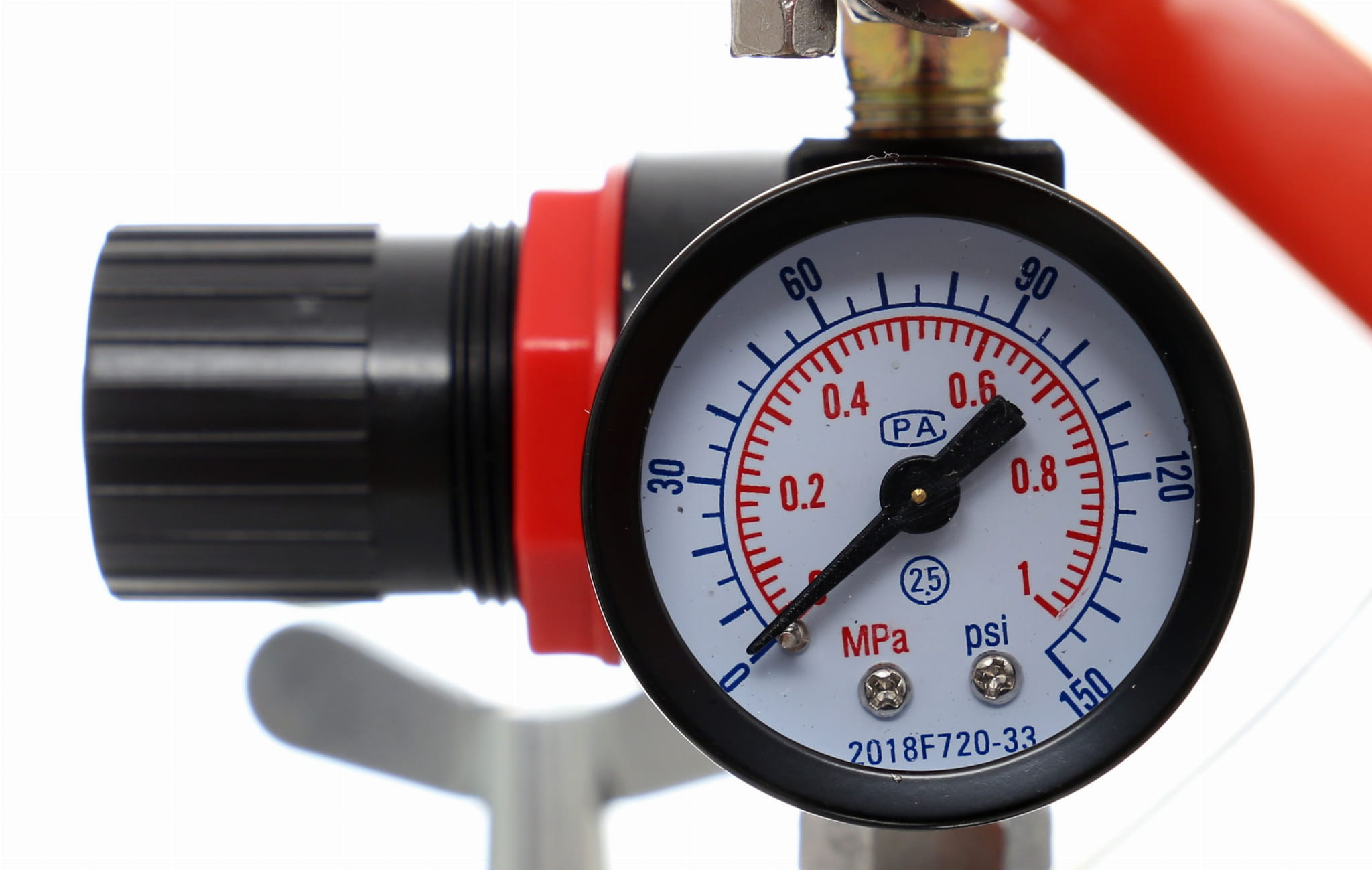 Reduktor zamontowany na pokrywie zbiornika umożliwia płynną regulację ciśnienia podawania farby. Manometr pozwala na bieżąco kontrolować wartość roboczą, co jest istotne przy pracy z materiałami o różnej lepkości — inne ciśnienie jest wymagane dla rzadkich emulsji, inne dla gęstszych lakierów.