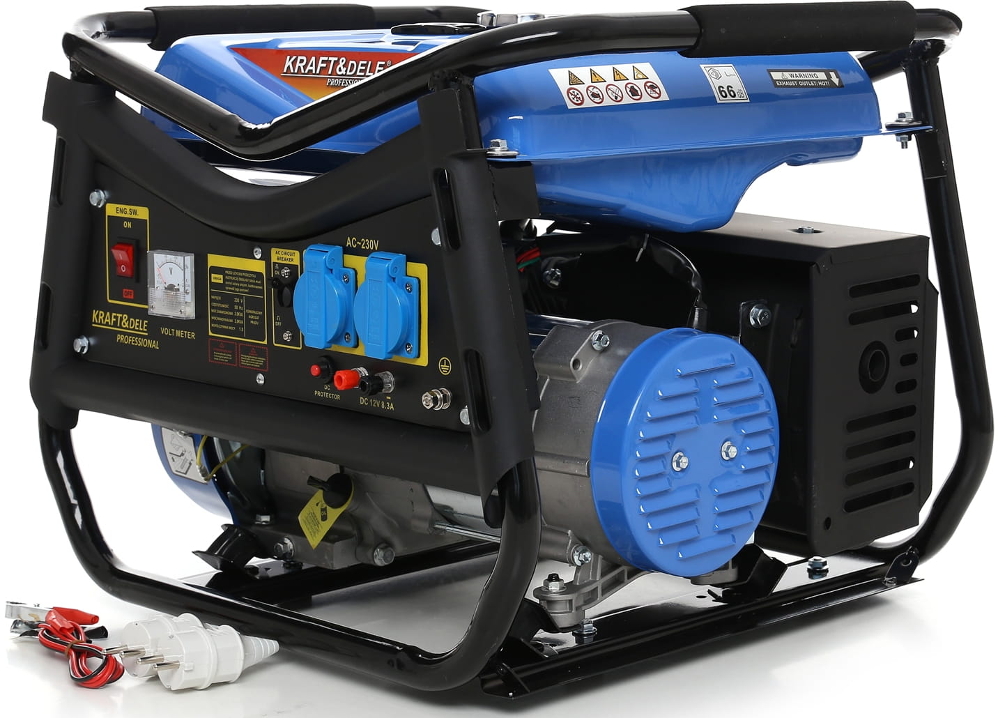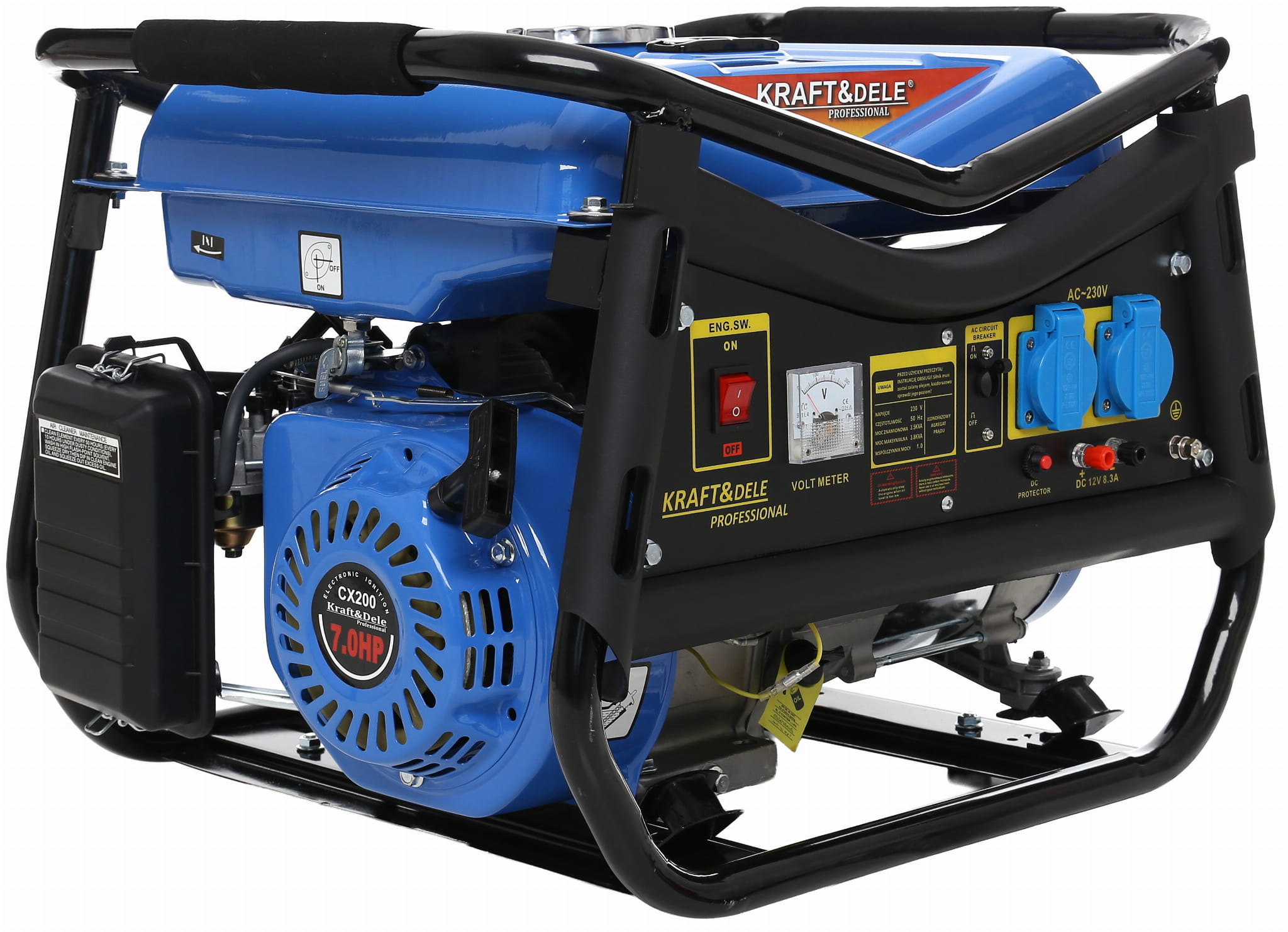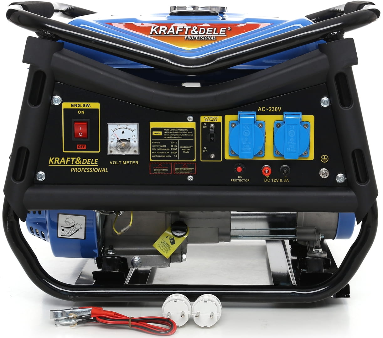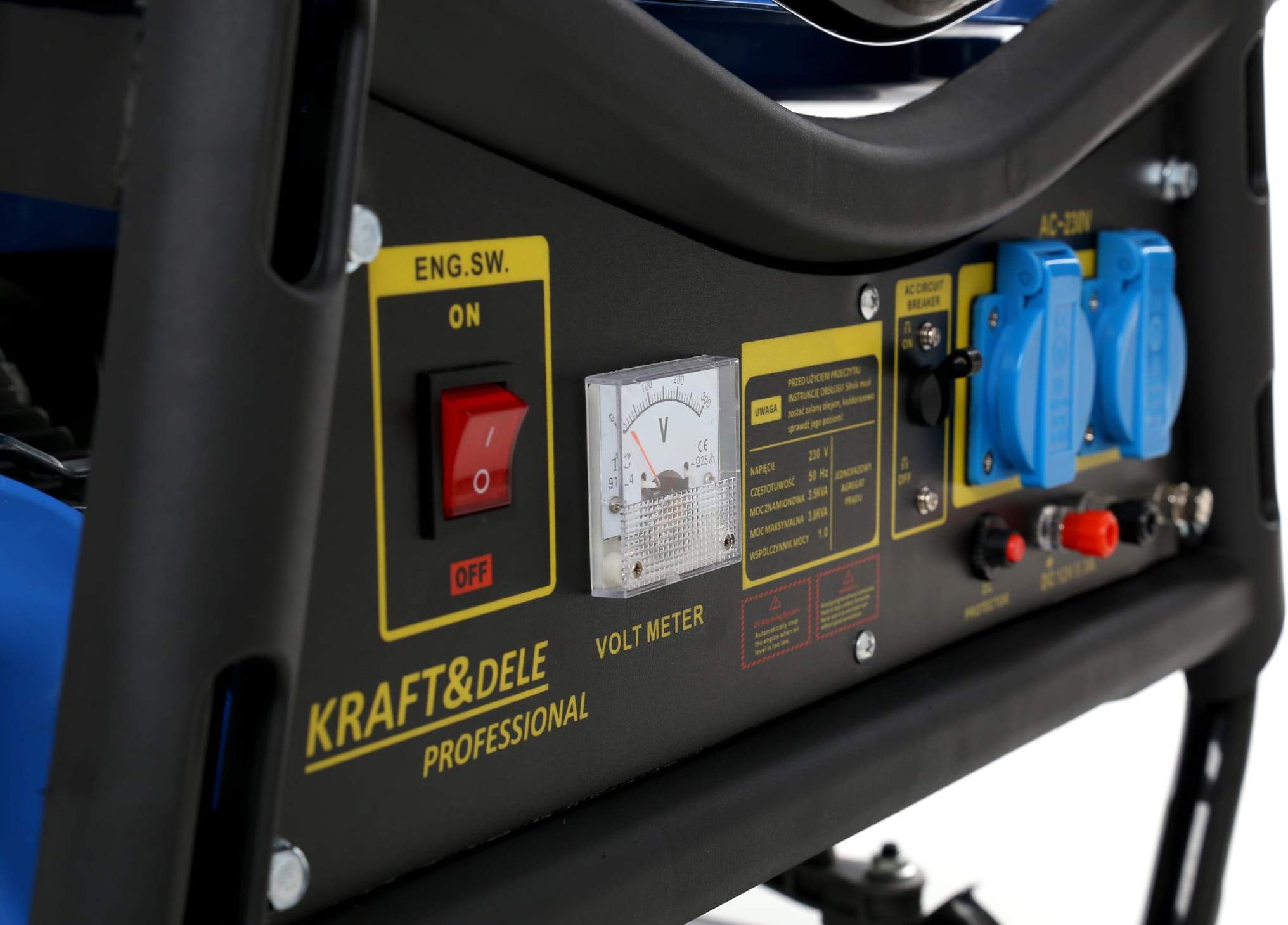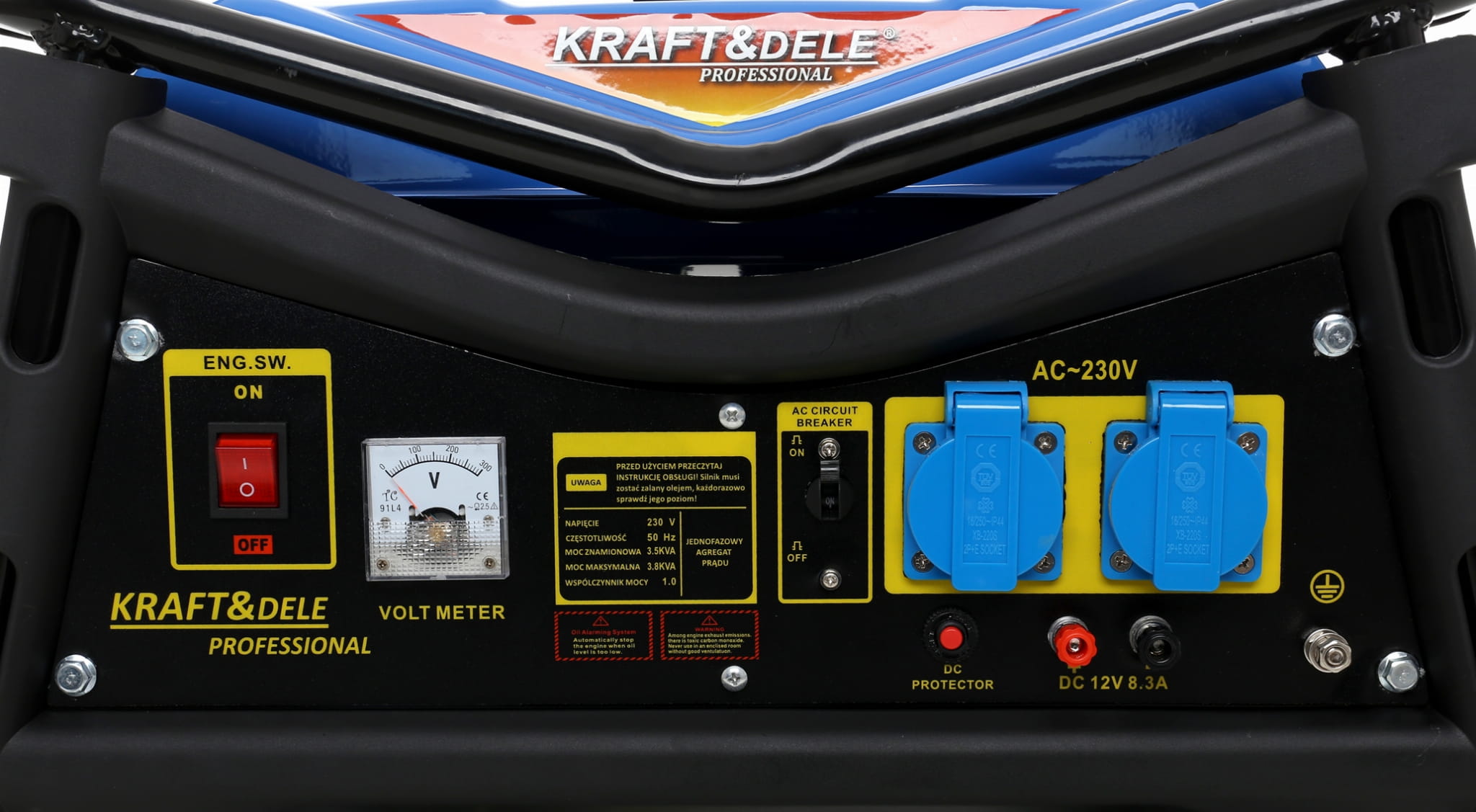 Dwa gniazda 230V pozwalają jednocześnie podłączyć kilka urządzeń. Wyjście 12V DC służy do ładowania akumulatorów samochodowych lub zasilania urządzeń 12V. Wbudowany woltomierz umożliwia bieżącą kontrolę napięcia, a wskaźnik poziomu paliwa informuje o stanie zbiornika.