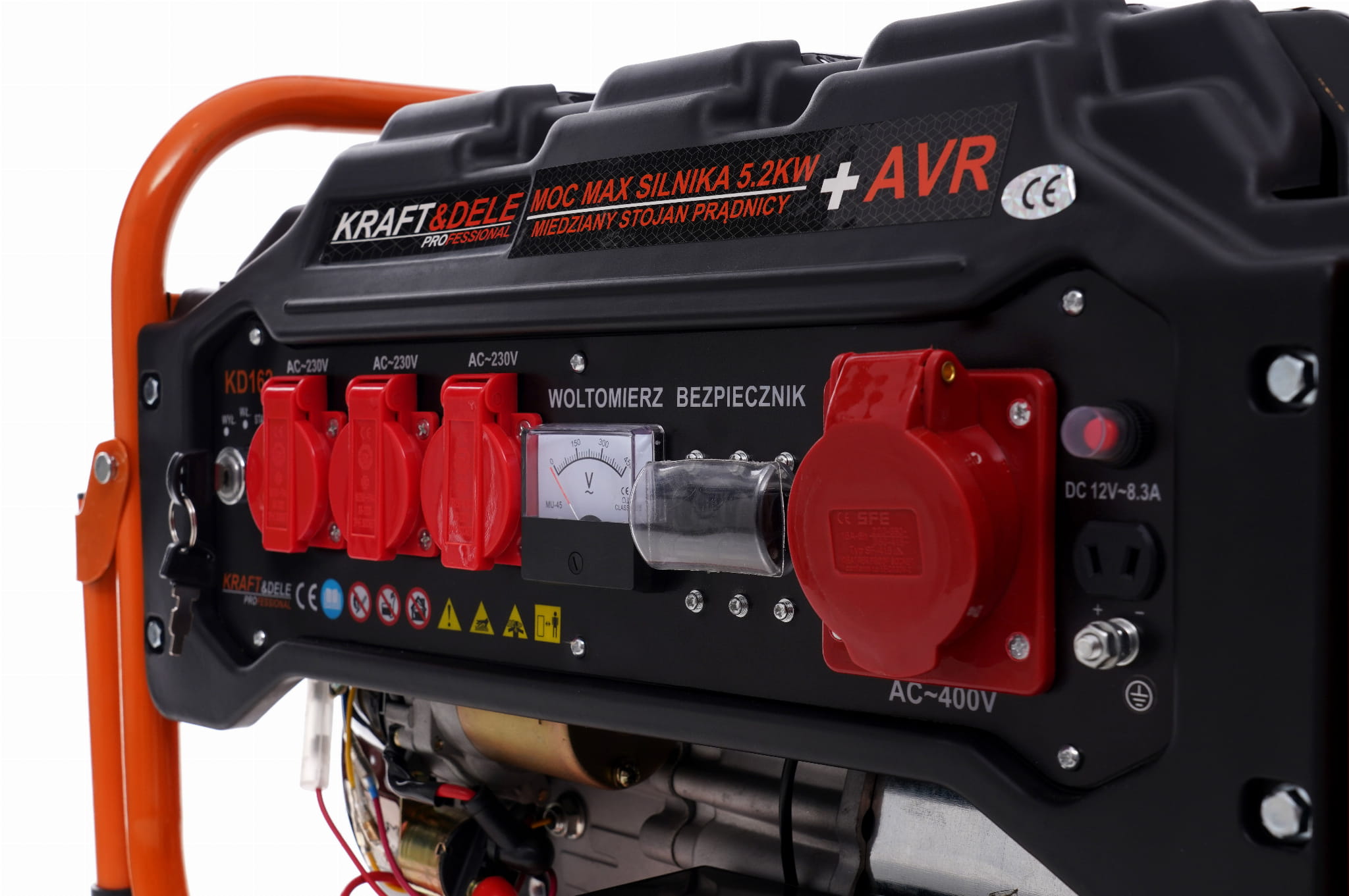 KD163 to benzynowy agregat prądotwórczy z silnikiem OHV 4-suwowym o mocy 7 KM, generujący napięcie 230V, 380V oraz 12V. Urządzenie przeznaczone do zasilania awaryjnego i roboczego w miejscach bez dostępu do sieci energetycznej — na budowach, w gospodarstwach rolnych, warsztatach oraz podczas prac terenowych.