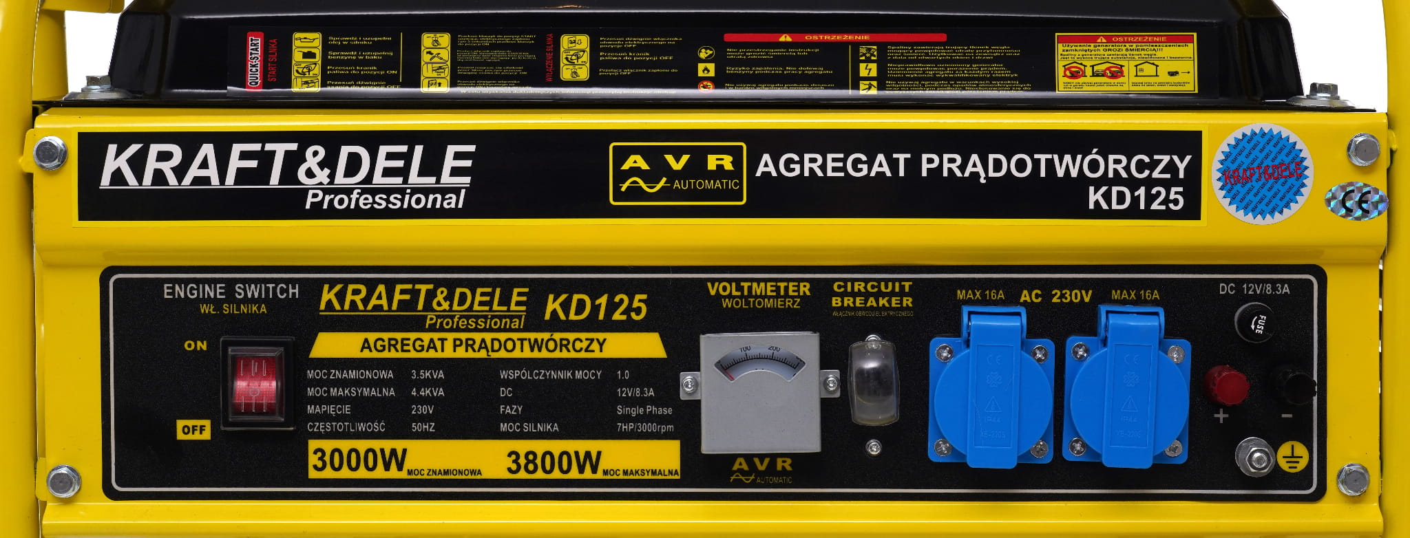 KD125 to jednofazowy agregat prądotwórczy z silnikiem benzynowym o mocy 7 HP, przeznaczony do zasilania awaryjnego oraz pracy mobilnej. Zbiornik 15 litrów zapewnia około 12 godzin ciągłej pracy, a technologia inteligentnej przepustnicy automatycznie dopasowuje obroty silnika do aktualnego poboru mocy.