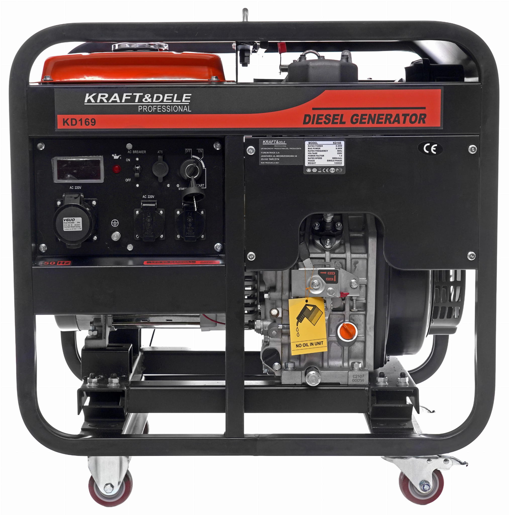 KD169 to jednofazowy agregat prądotwórczy zasilany olejem napędowym, wyposażony w silnik czterosuwowy o pojemności 668 ccm i mocy 11 kW. Urządzenie generuje moc ciągłą 9000 W i dysponuje gniazdem 32A, co umożliwia podłączenie spawarek, kompresorów oraz innych odbiorników o wysokim poborze prądu. Miedziana prądnica z regulatorem AVR i technologia inteligentnej przepustnicy zapewniają stabilne napięcie oraz ekonomiczną eksploatację.