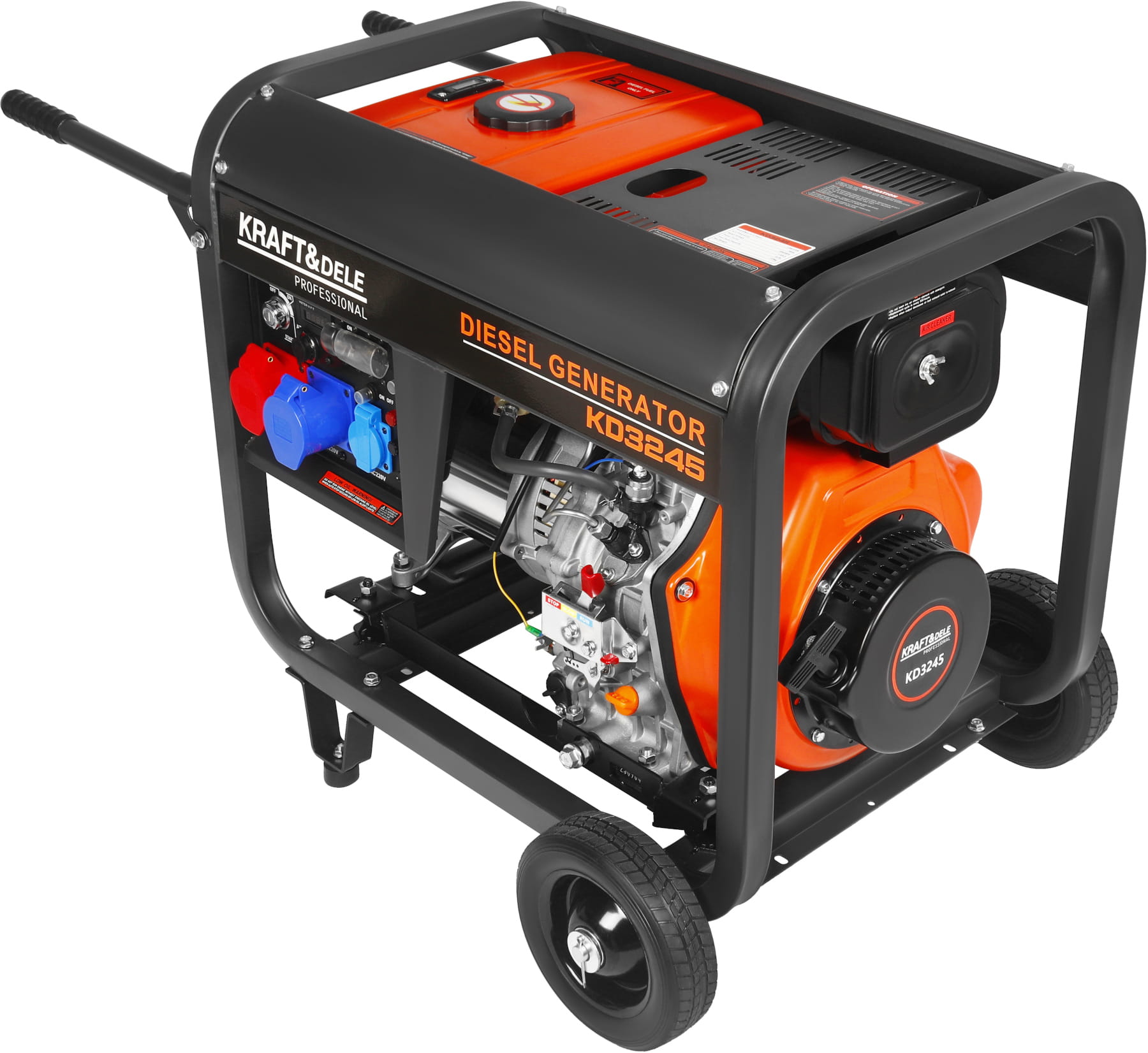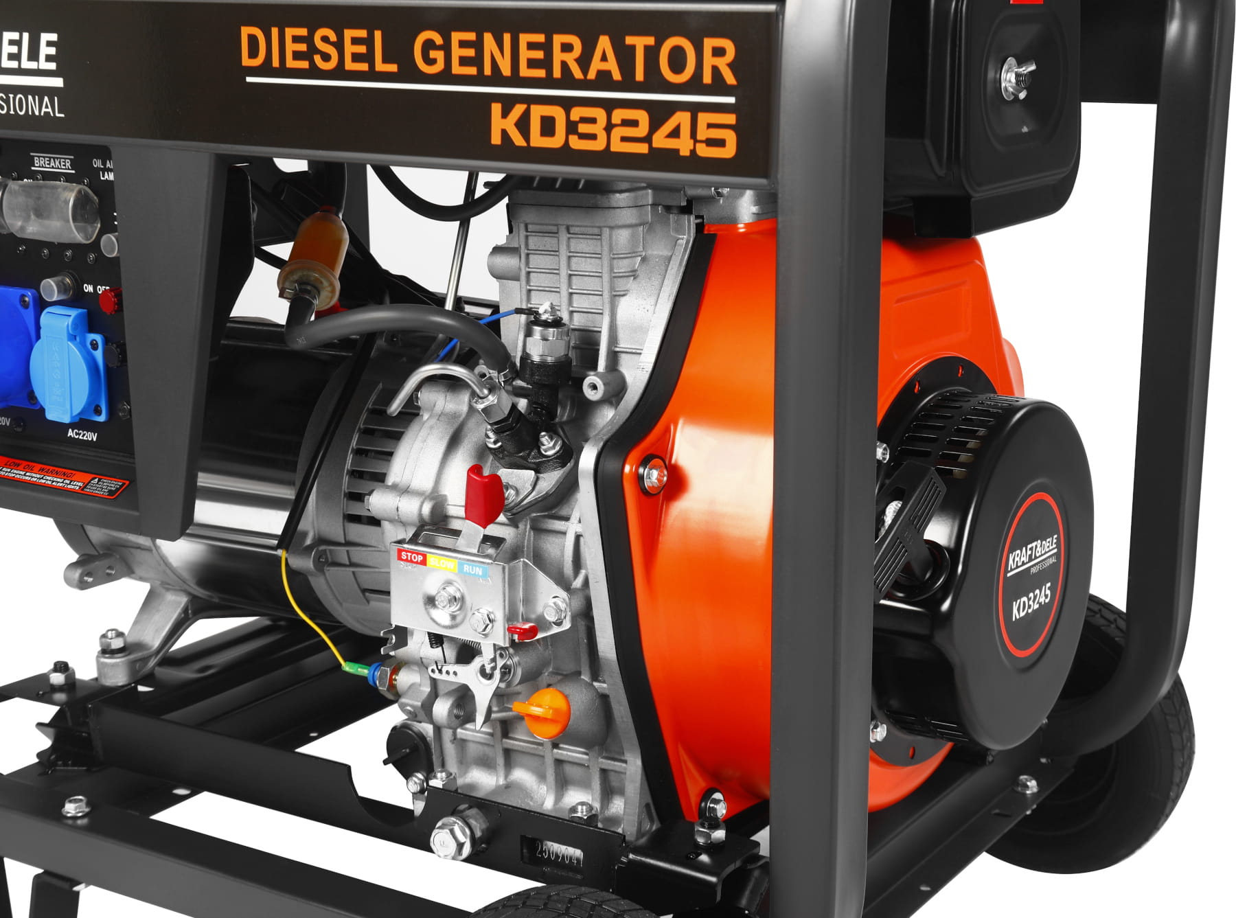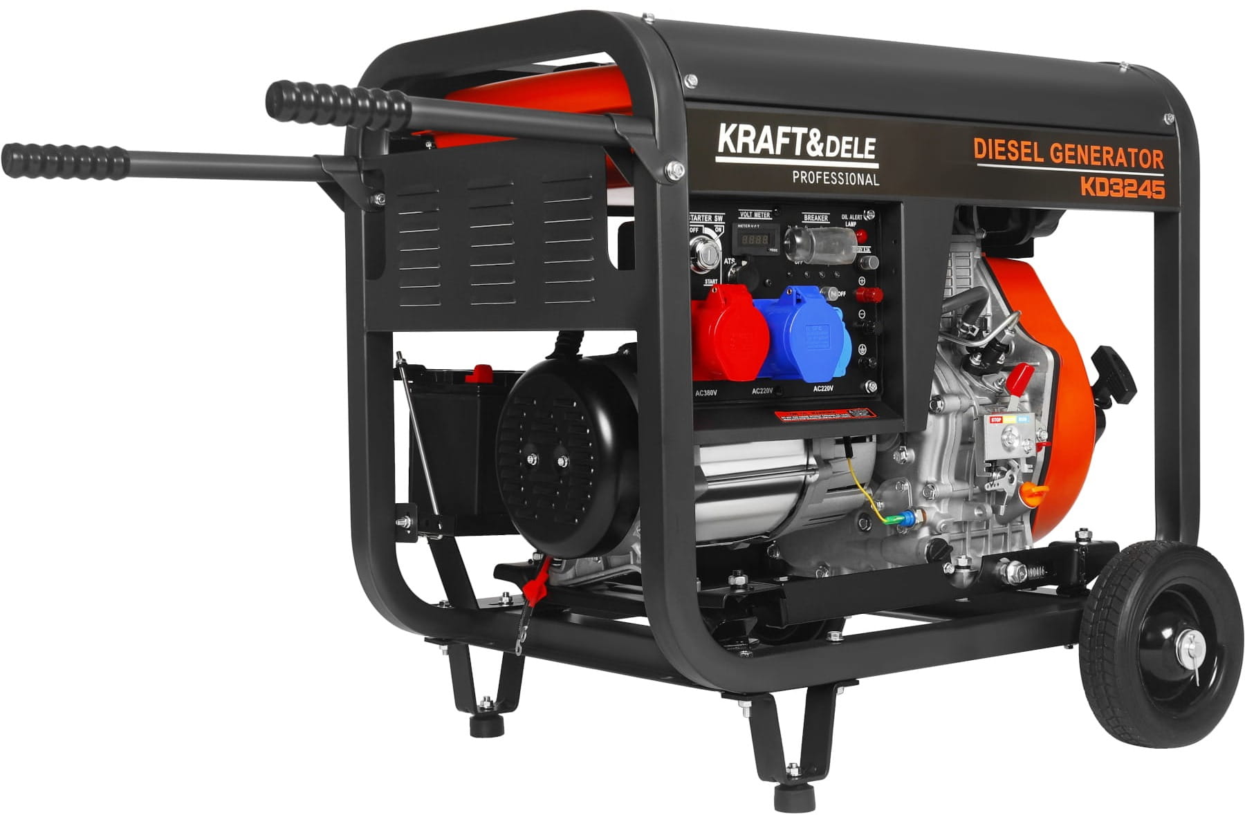KD3245 to trójfazowy agregat prądotwórczy z silnikiem wysokoprężnym o pojemności 668 cc, przeznaczony do zasilania urządzeń jednofazowych i trójfazowych w warunkach braku dostępu do sieci energetycznej lub jako rezerwowe źródło zasilania. Konstrukcja opiera się na stalowej ramie z silnikiem montowanym na poduszkach antywibracyjnych i elektrycznym układem rozruchu.