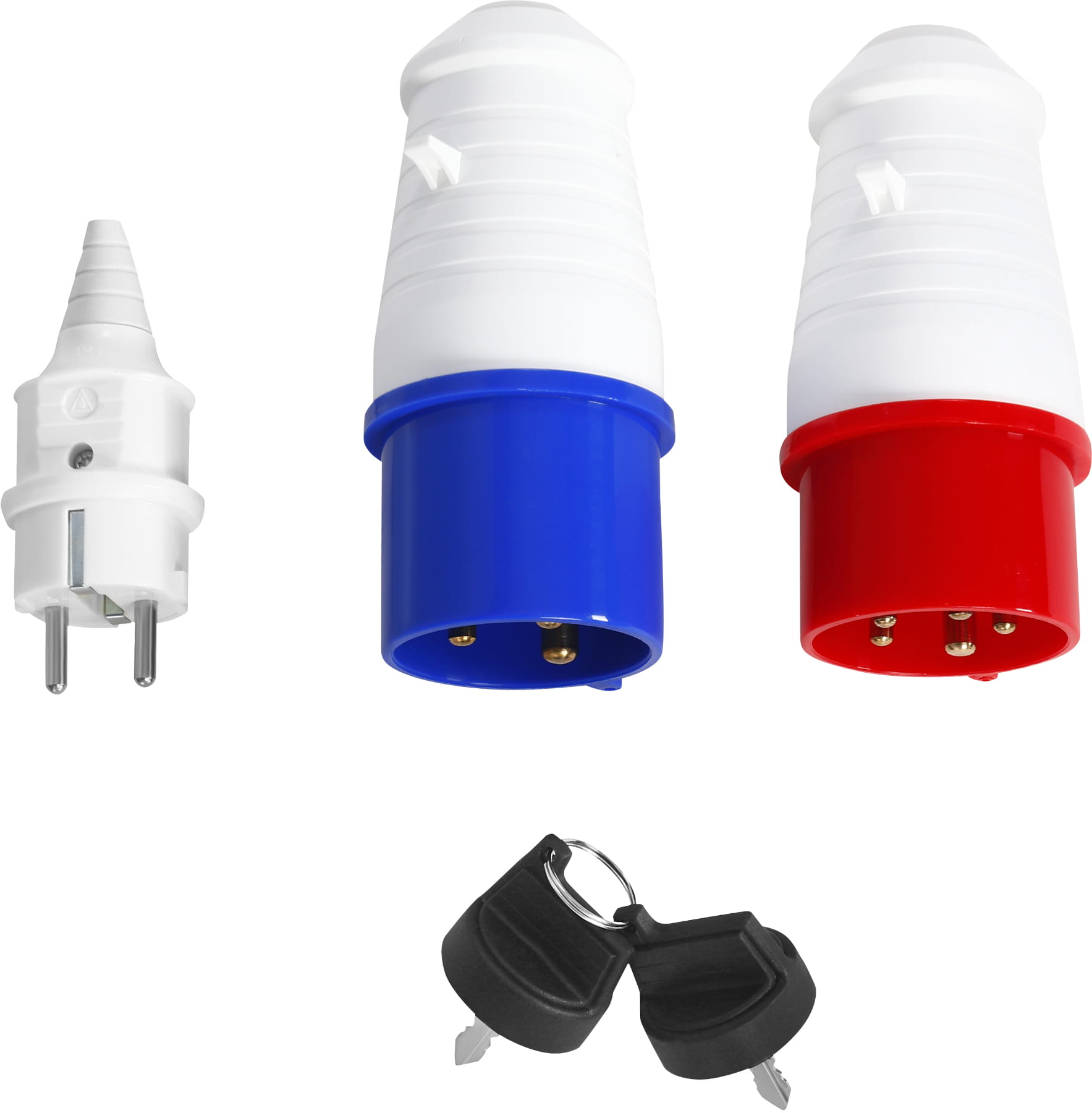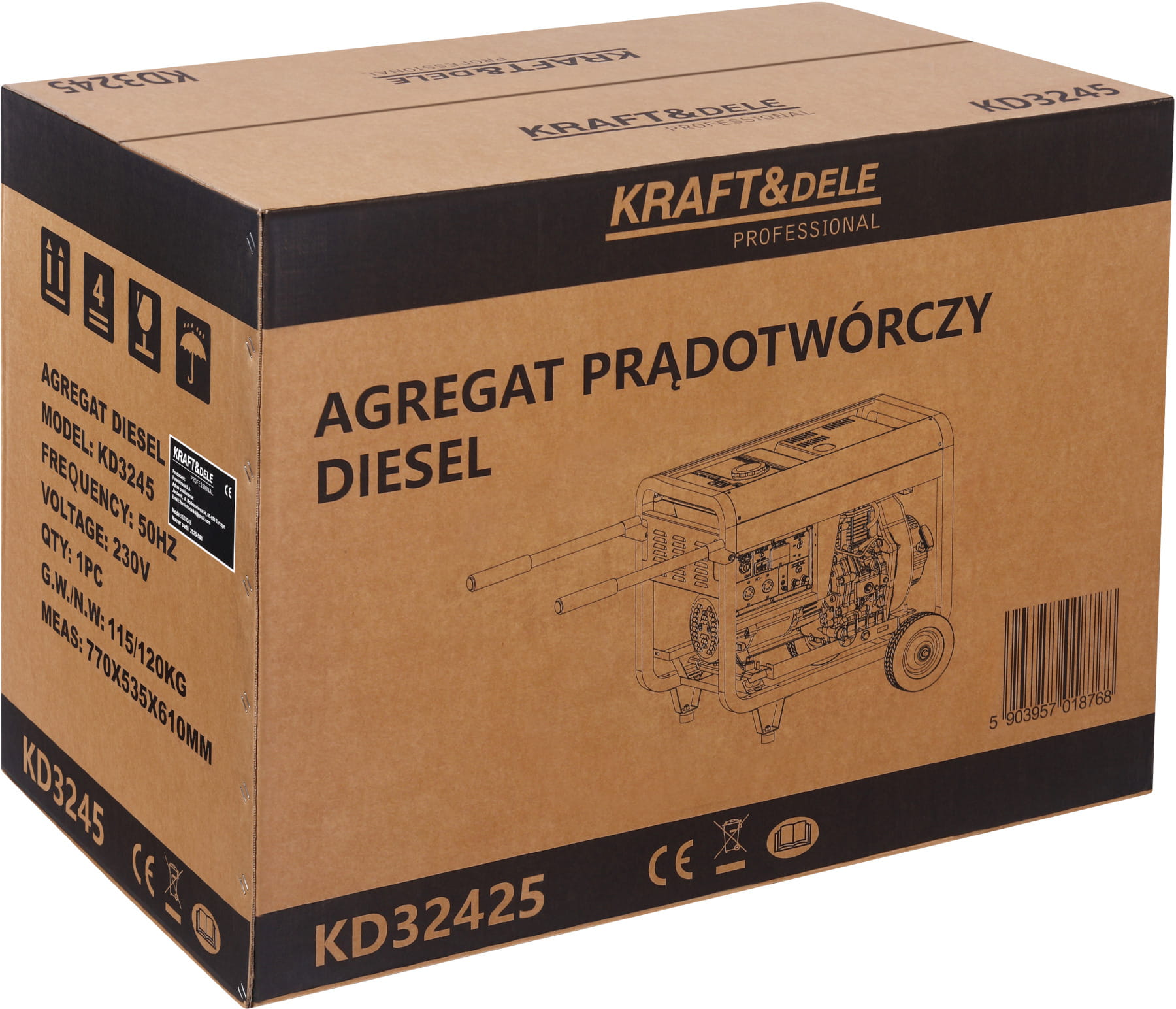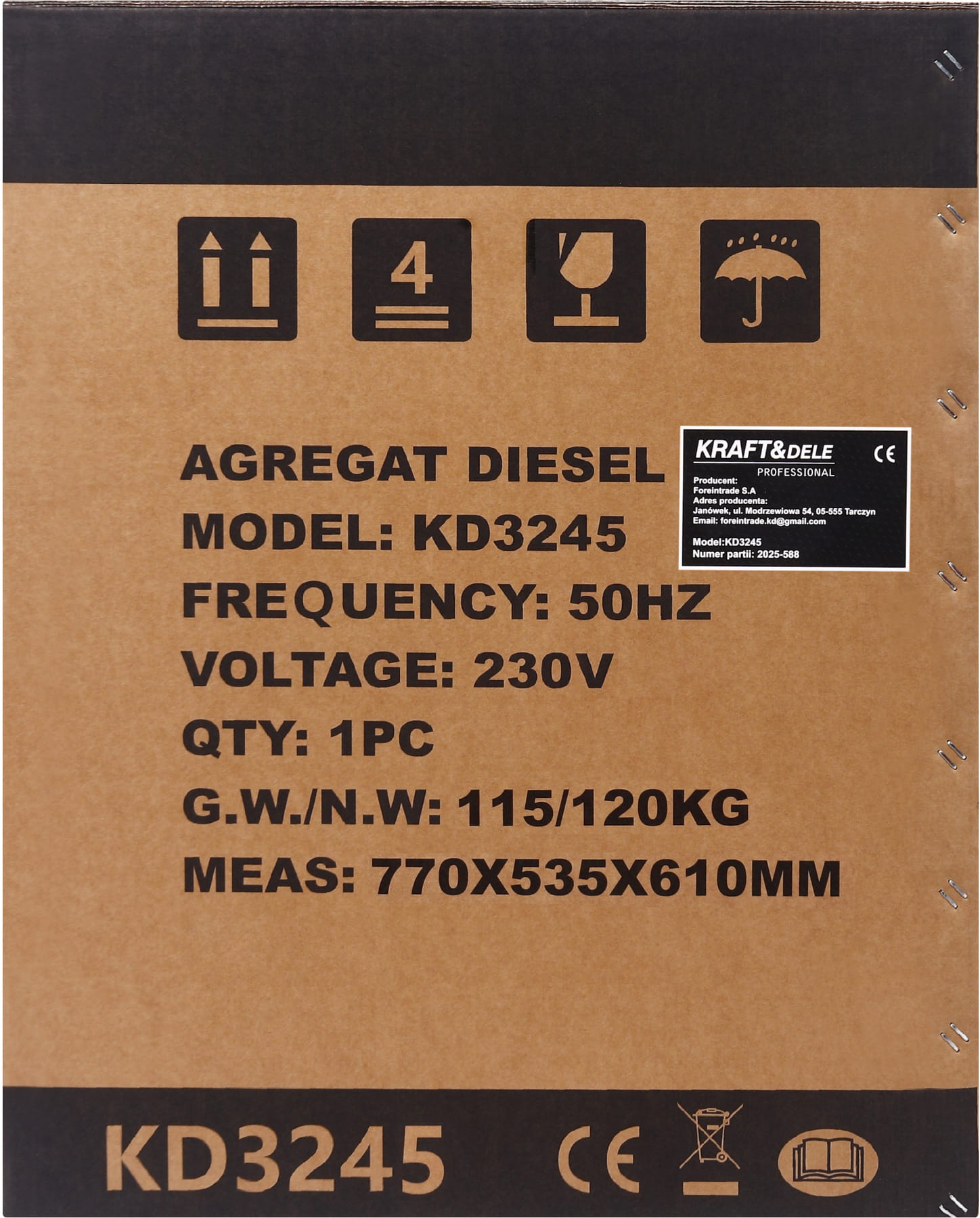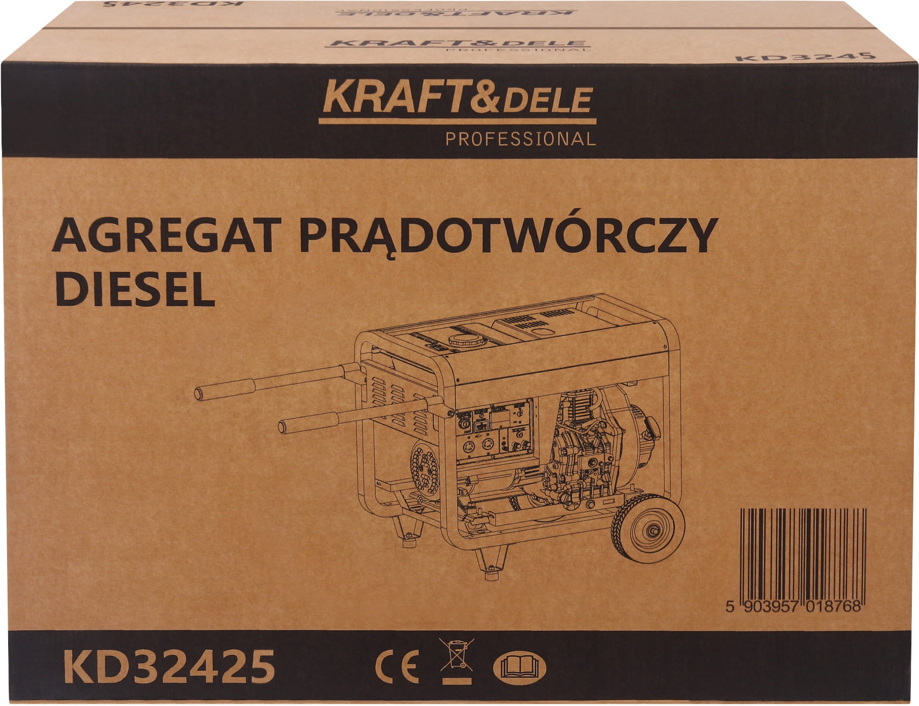 Agregat prądotwórczy KD3245, zapasowy kluczyk, wtyczka 230V, wtyczka 230V 32A, wtyczka 400V, instrukcja obsługi w języku polskim, oryginalne opakowanie.