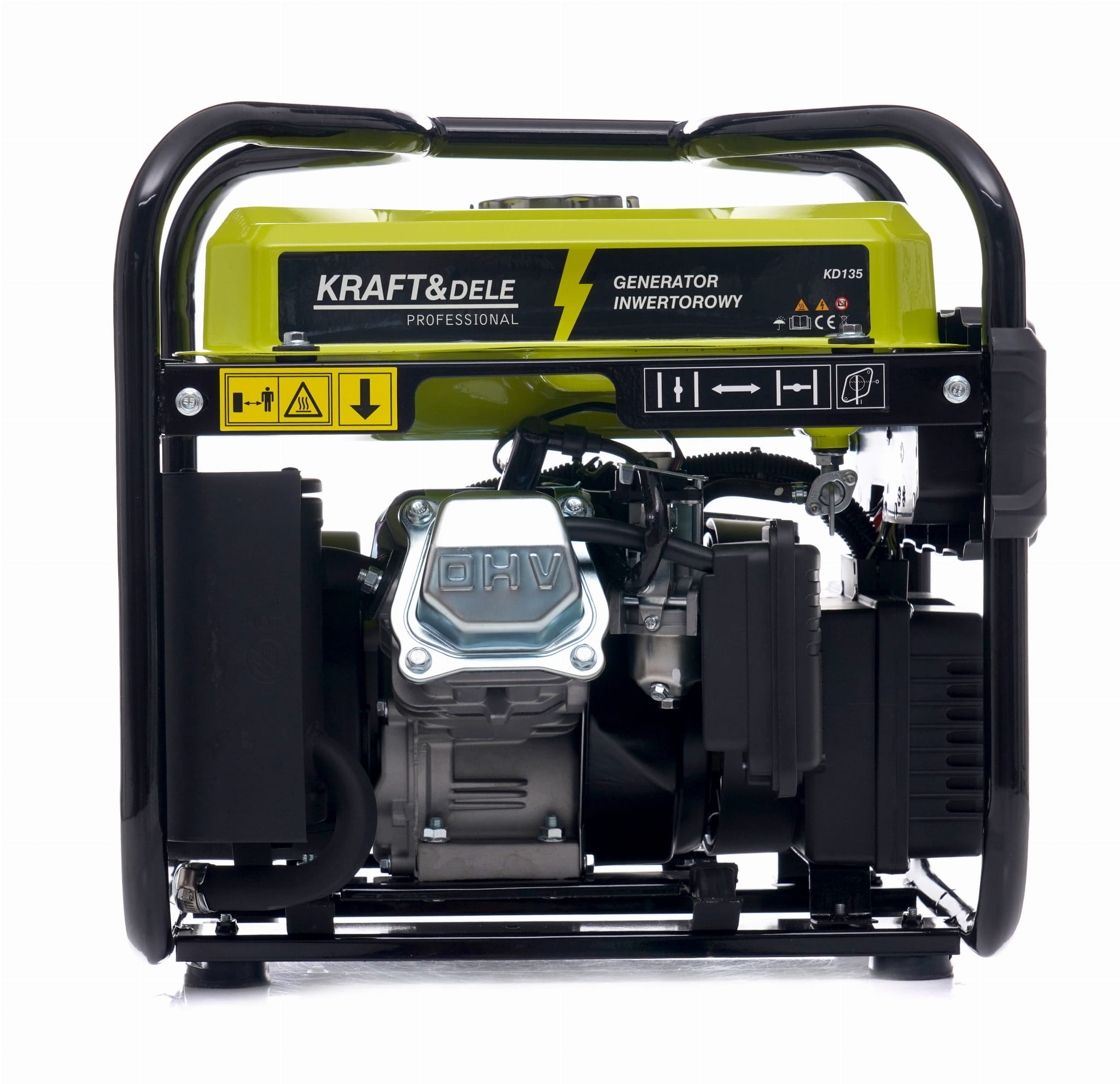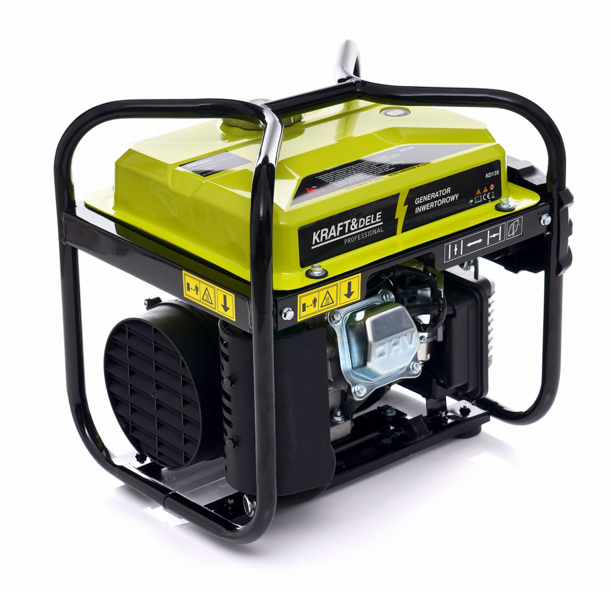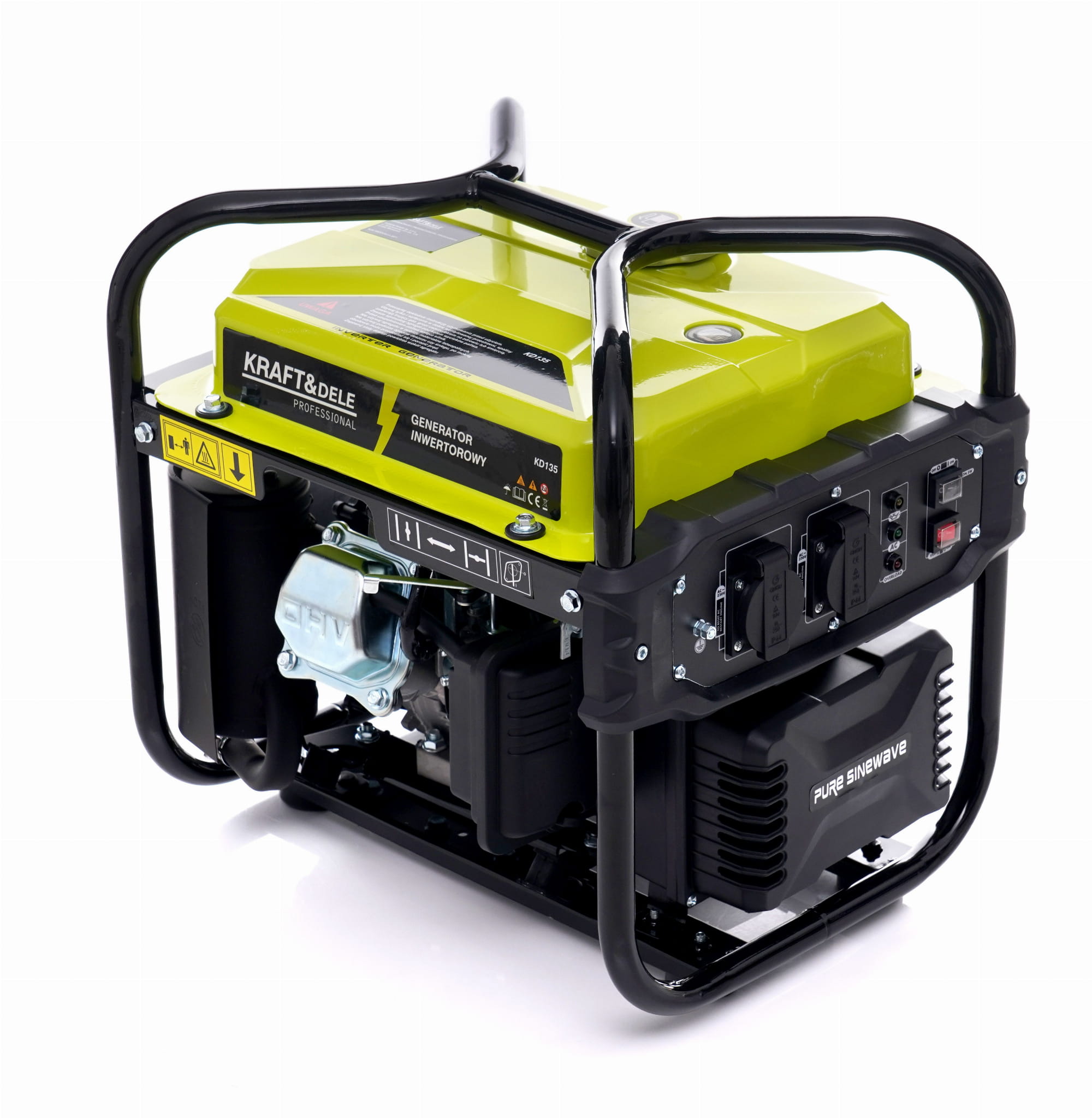 KD135 to agregat inwertorowy z silnikiem jednocylindrowym OHV o pojemności 119 cc, wyposażony w układ inteligentnej przepustnicy automatycznie dostosowującej obroty do aktualnego obciążenia. Urządzenie generuje stabilizowane napięcie 230 V / 50 Hz, co czyni je odpowiednim źródłem zasilania zarówno dla sprzętu AGD, jak i elektroniki użytkowej wrażliwej na wahania napięcia.