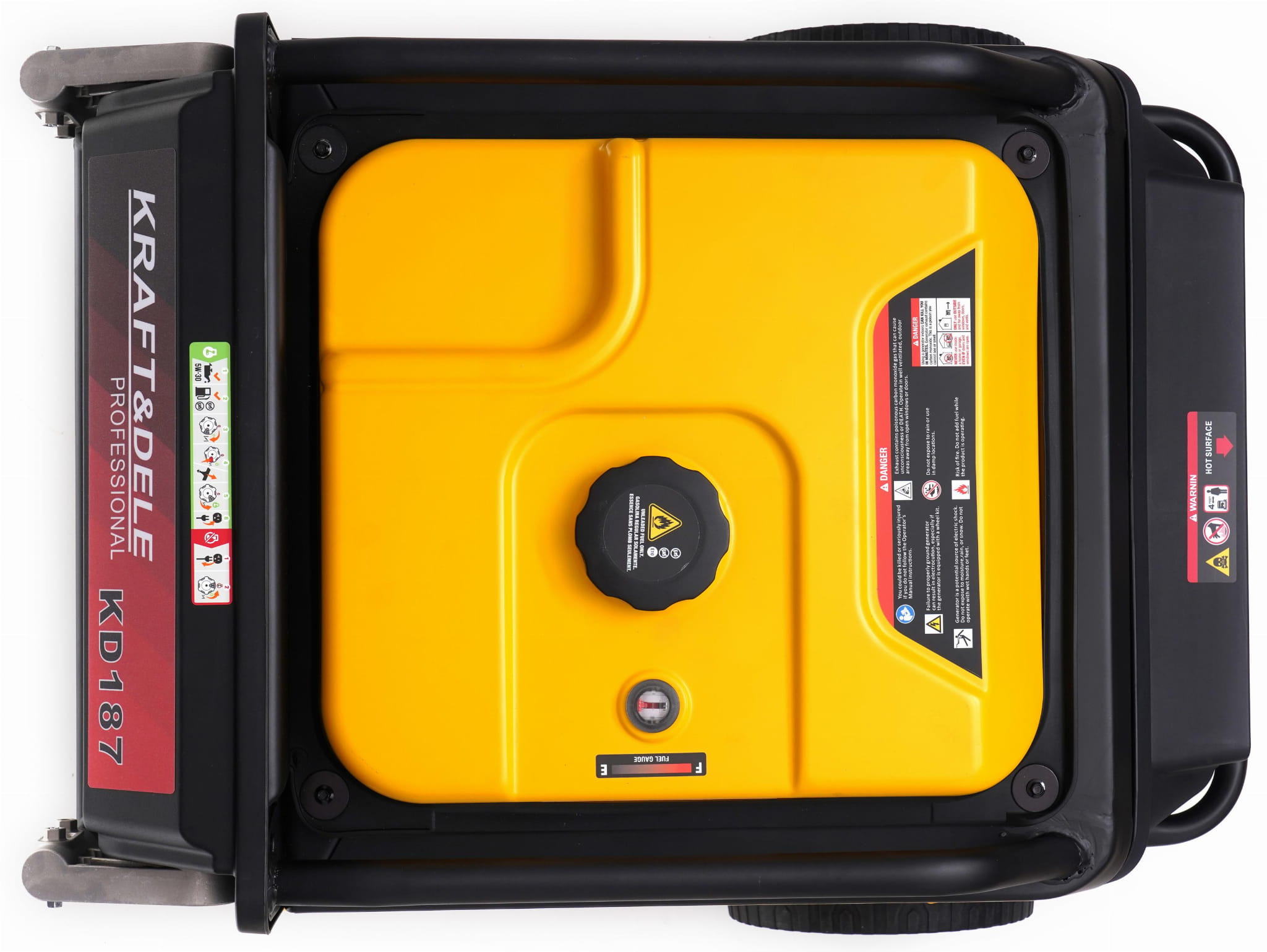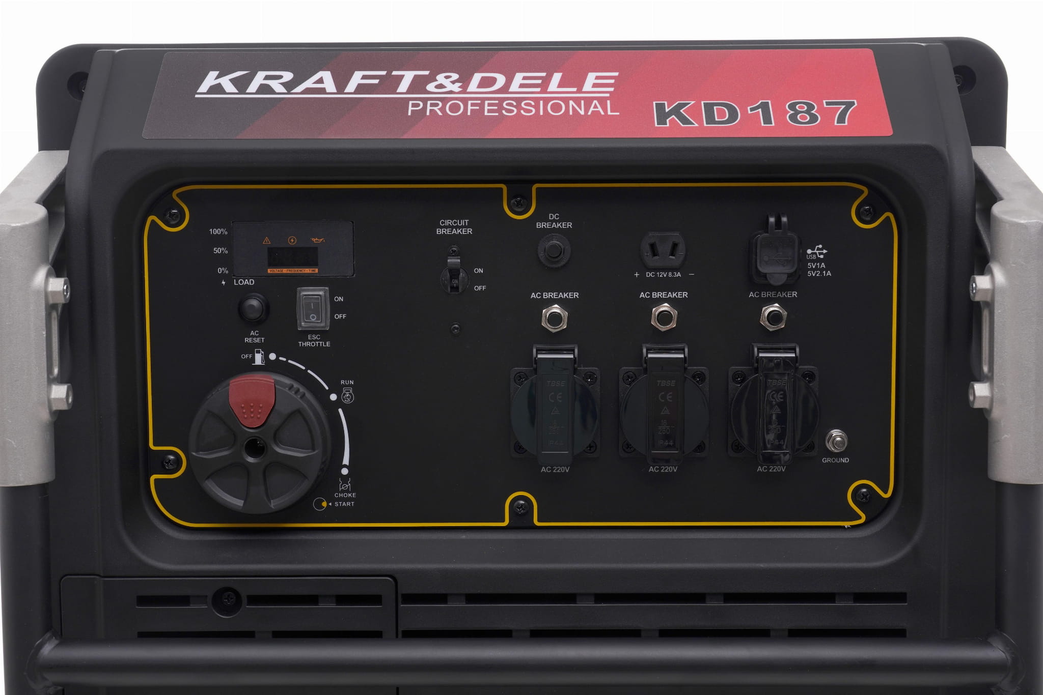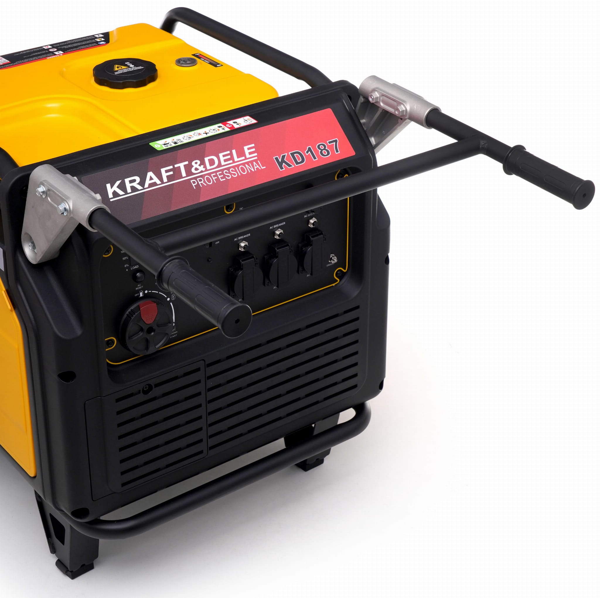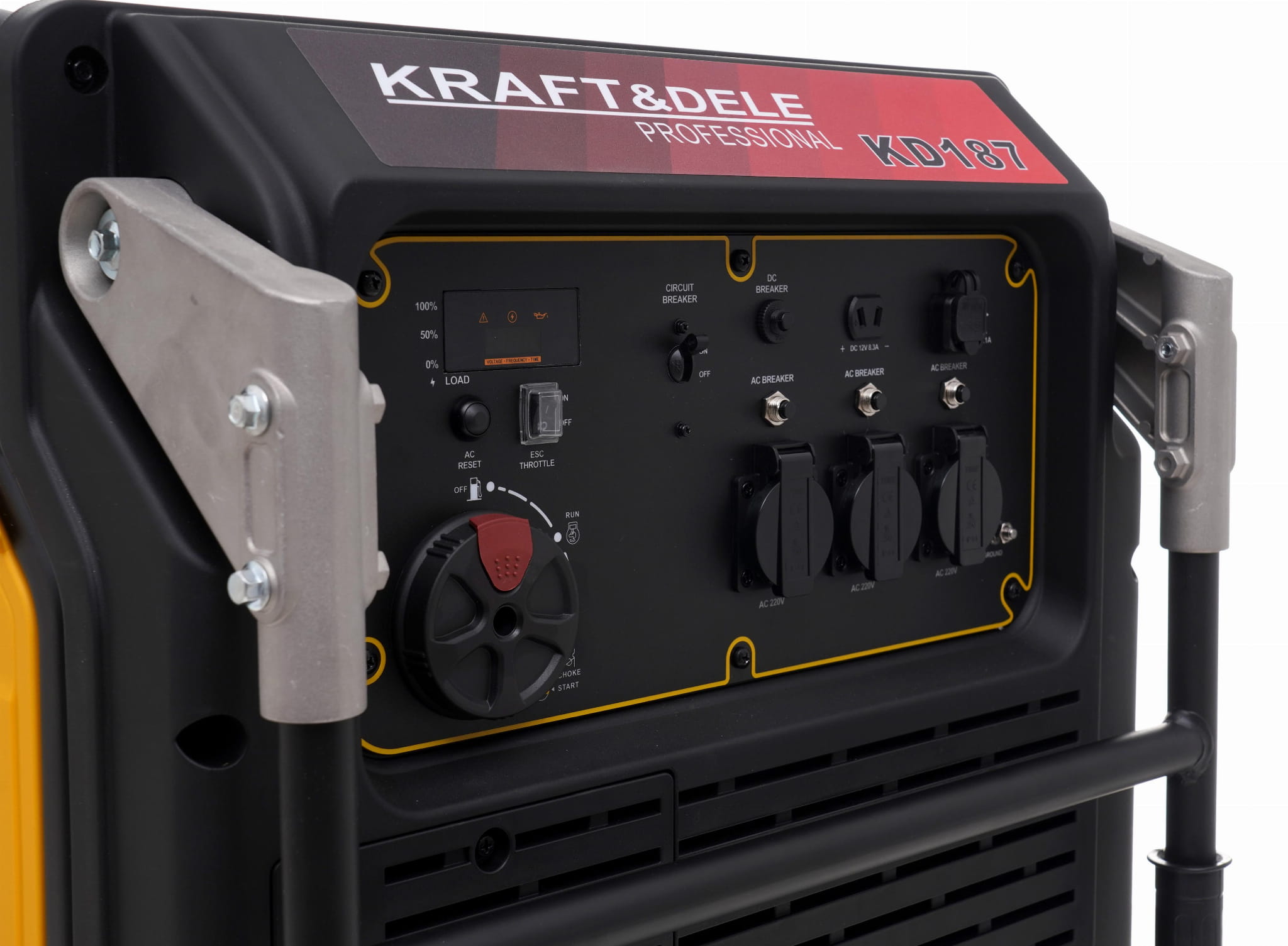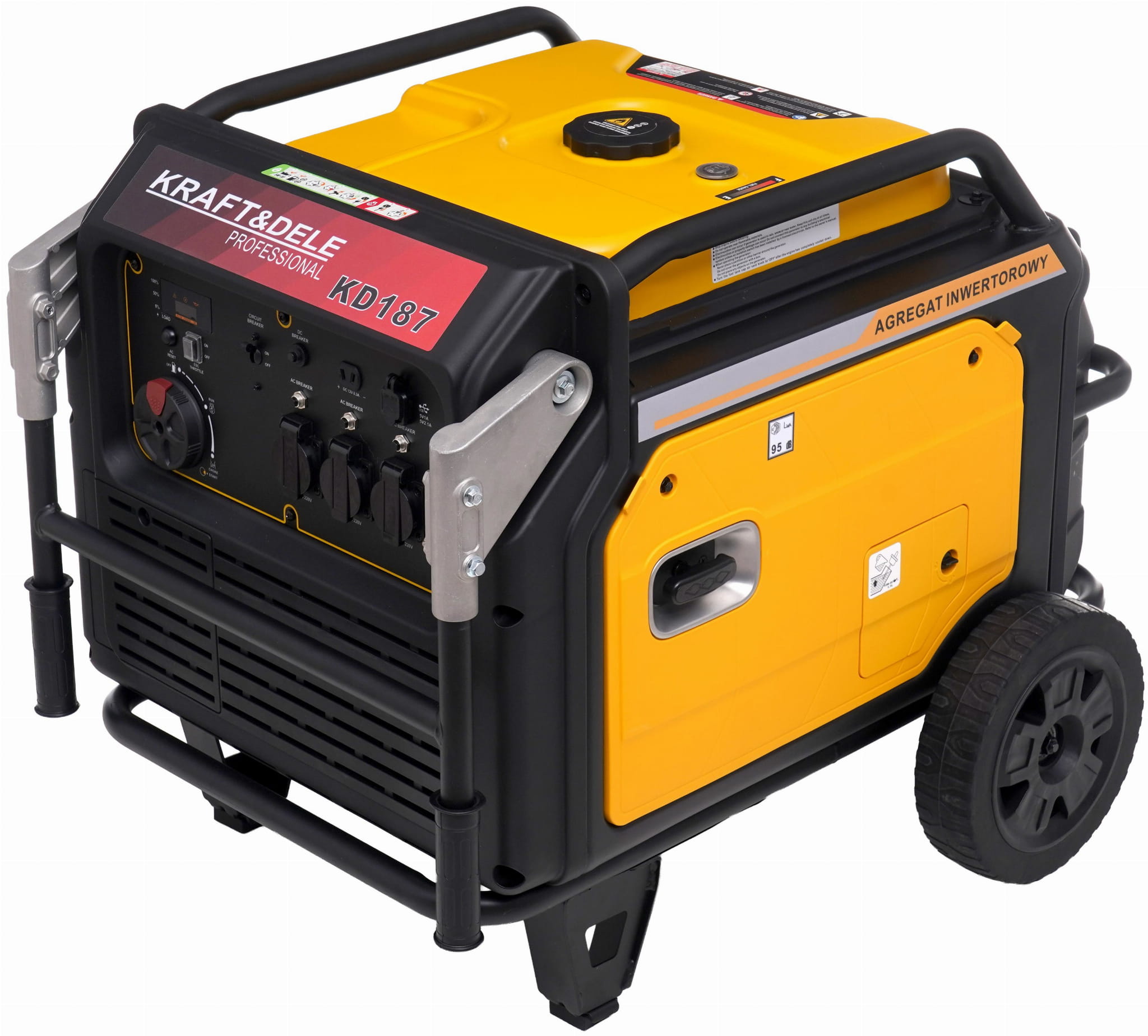 KD187 to benzynowy agregat inwertorowy o mocy 8 kW, wyposażony w jednocylindrowy silnik R420D-Vi o pojemności 420 cc. Technologia inwerterowa zapewnia czystą sinusoidę zgodną z normą ISO 8528 G2, co umożliwia zasilanie urządzeń wrażliwych na jakość napięcia — komputerów, sprzętu medycznego, elektroniki pomiarowej czy audio. Rozrusznik elektryczny, zbiornik paliwa o pojemności 20,3 l oraz kółka transportowe z składanymi uchwytami pozycjonują ten model jako mobilne źródło zasilania awaryjnego i terenowego.