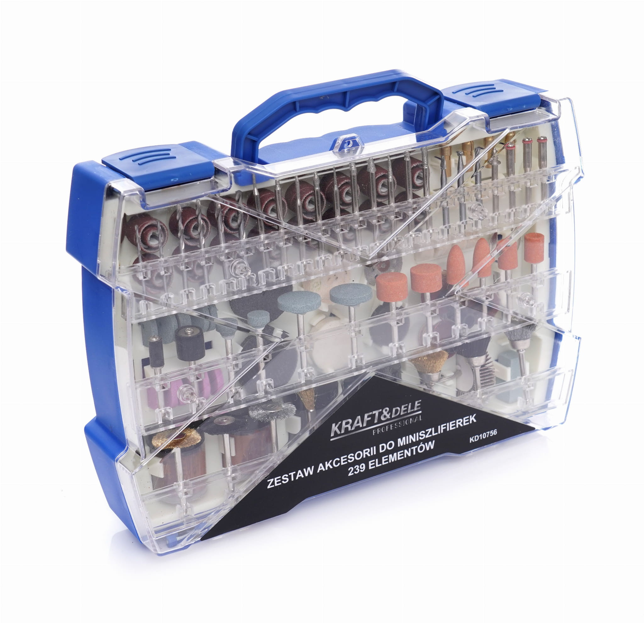 KD10756 to kompletny zestaw osprzętu przeznaczony do miniszlifierek rotacyjnych. Zawiera 239 elementów różnego typu — od frezów węglikowych i kamieni szlifierskich, przez tarcze korundowe, aż po filce i pastę polerską. Zestaw umożliwia realizację szerokiego zakresu prac obróbczych bez konieczności dokupowania dodatkowych akcesoriów.