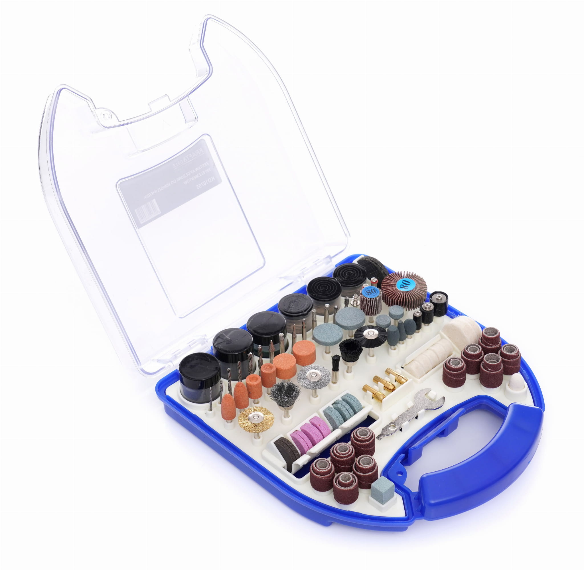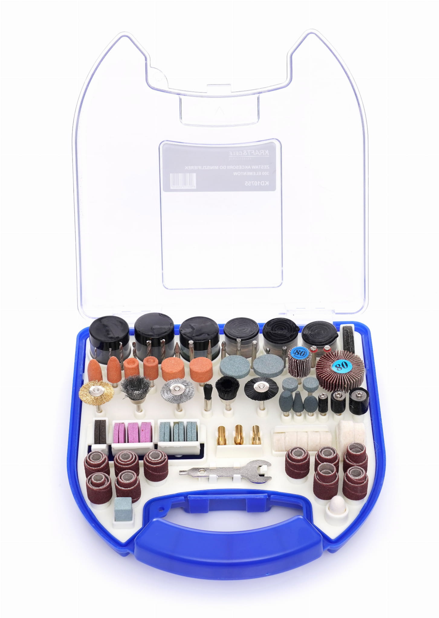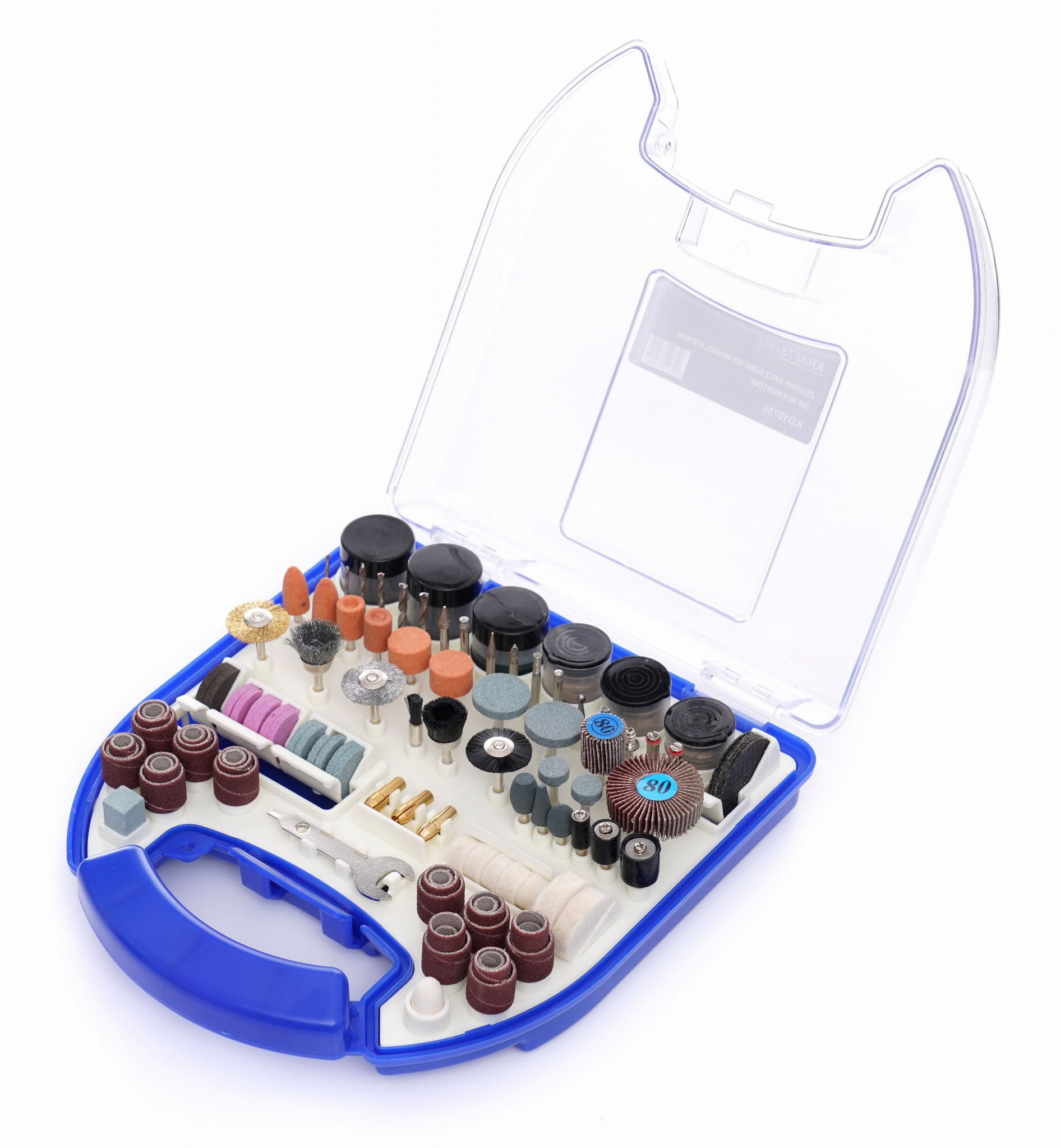 KD10755 to kompletny zestaw 300 akcesoriów przeznaczonych do współpracy z miniszlifierkami rotacyjnymi (typu Dremel i kompatybilnymi). Zestaw obejmuje narzędzia robocze do szlifowania, grawerowania, cięcia, polerowania i czyszczenia różnych materiałów. Całość przechowywana jest w sztywnej walizce z podziałkami, umożliwiającej szybką identyfikację i wygodny transport.