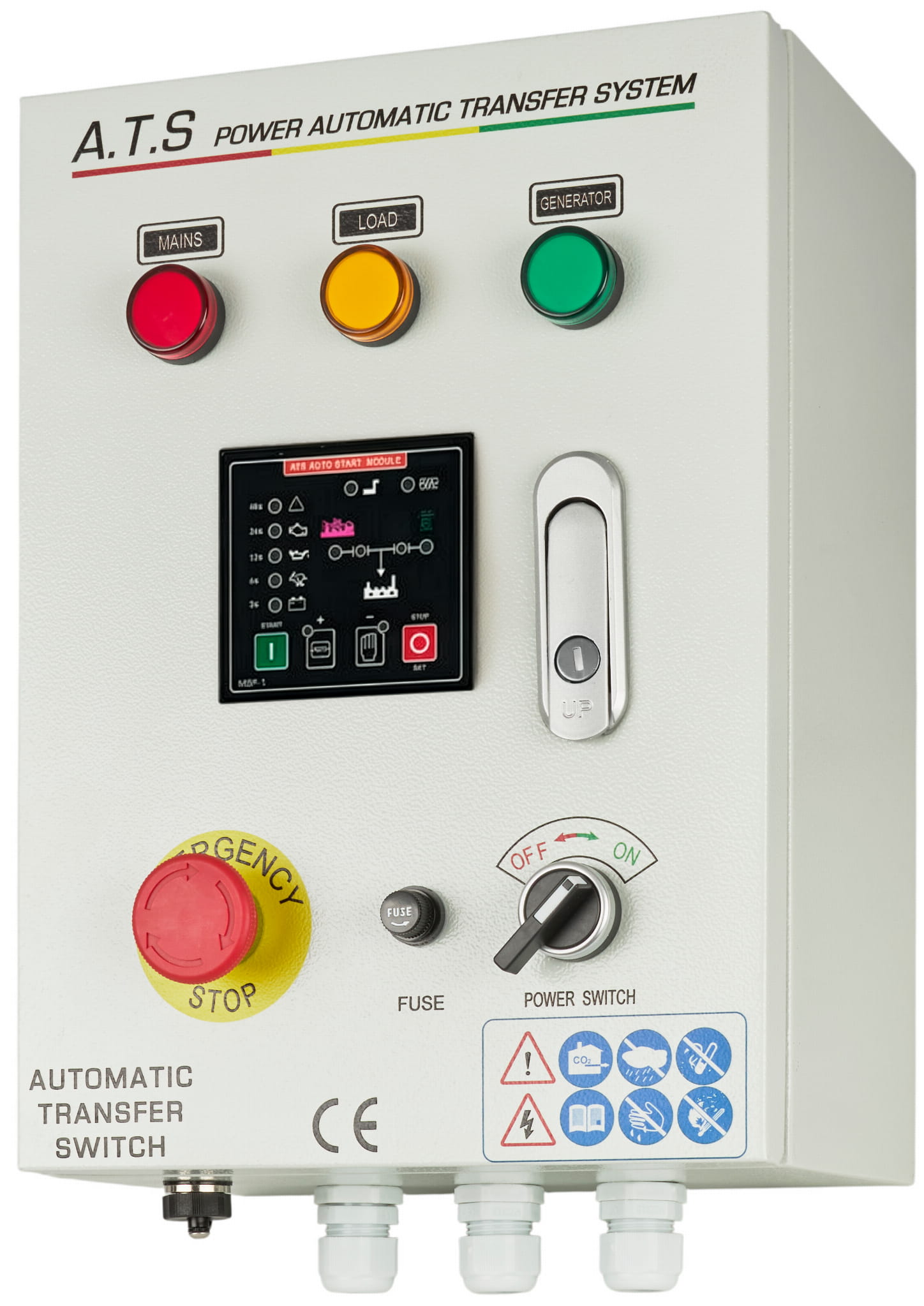 Po wykryciu zaniku napięcia sieciowego sterownik samoczynnie uruchamia agregat. Gdy napięcie wyjściowe generatora osiągnie wartość nominalną, system przełącza obciążenie na zasilanie awaryjne — bez konieczności ingerencji operatora.