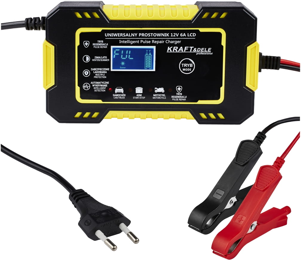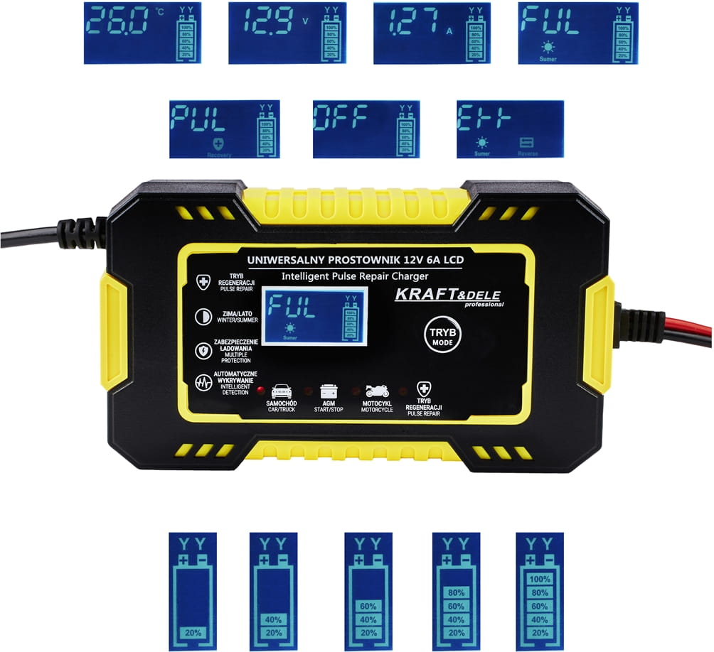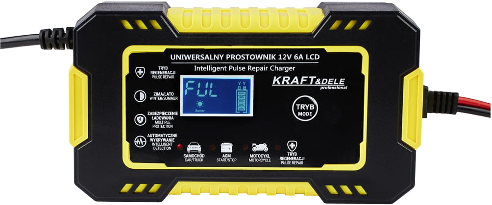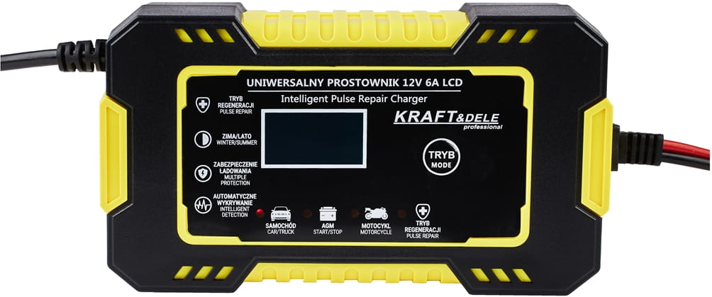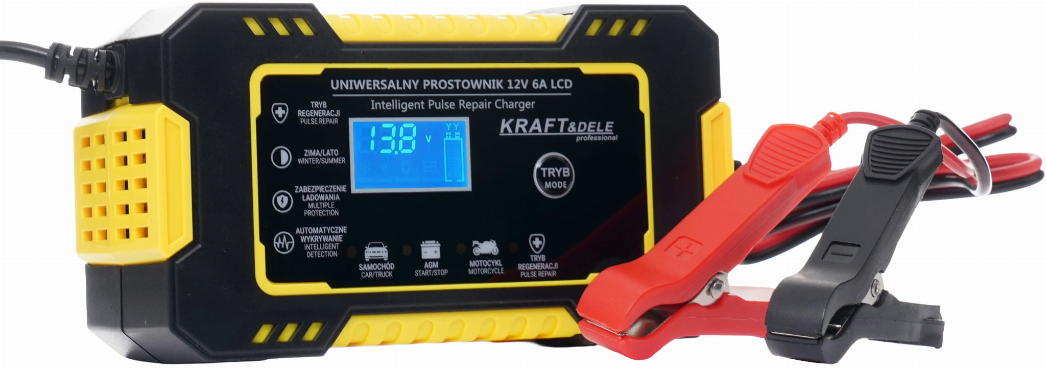 KD1290 to automatyczny prostownik przeznaczony do ładowania akumulatorów kwasowo-ołowiowych 12V, w tym akumulatorów samochodowych, motocyklowych oraz technologii AGM i Start-Stop. Urządzenie wyposażono w wyświetlacz LCD, cztery tryby pracy oraz układ kompensacji temperaturowej napięcia ładowania.