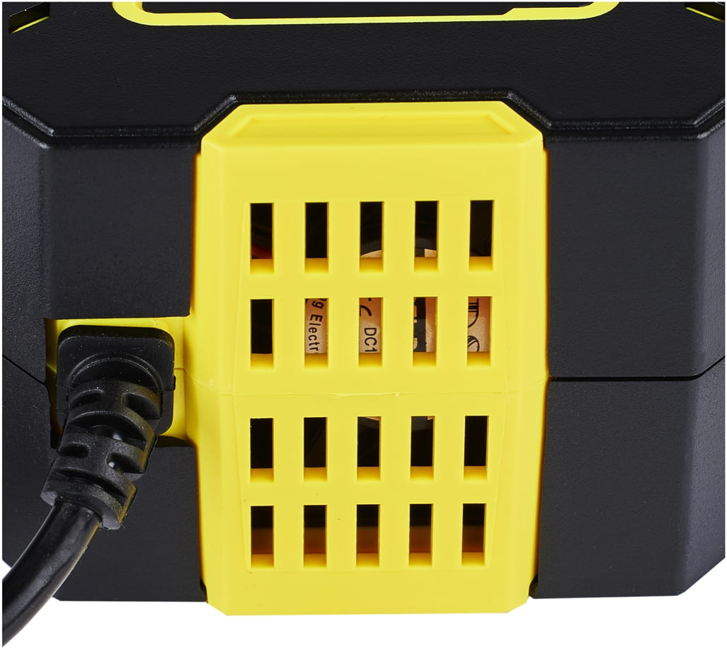 Ekran LCD na bieżąco pokazuje parametry procesu ładowania – stan naładowania, napięcie oraz aktywny tryb pracy. Pozwala to kontrolować przebieg ładowania bez konieczności stosowania zewnętrznych mierników.