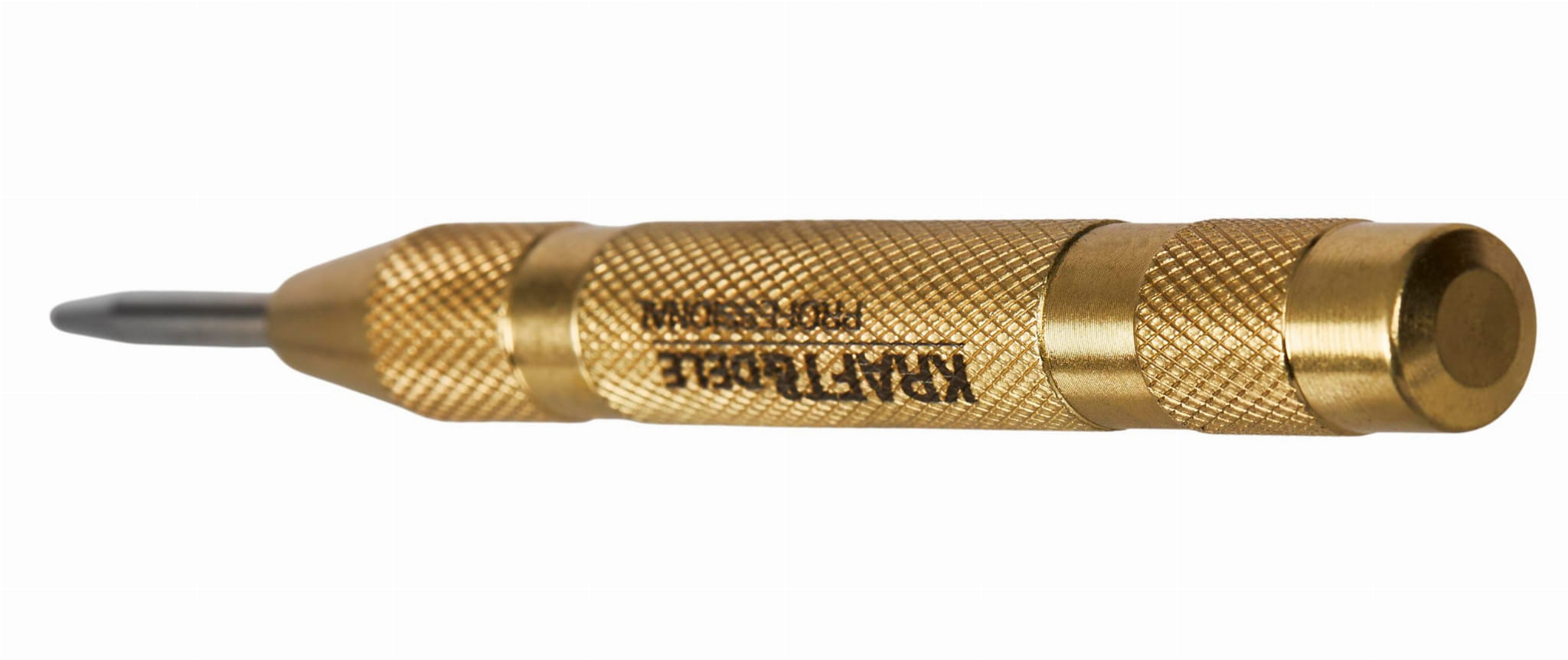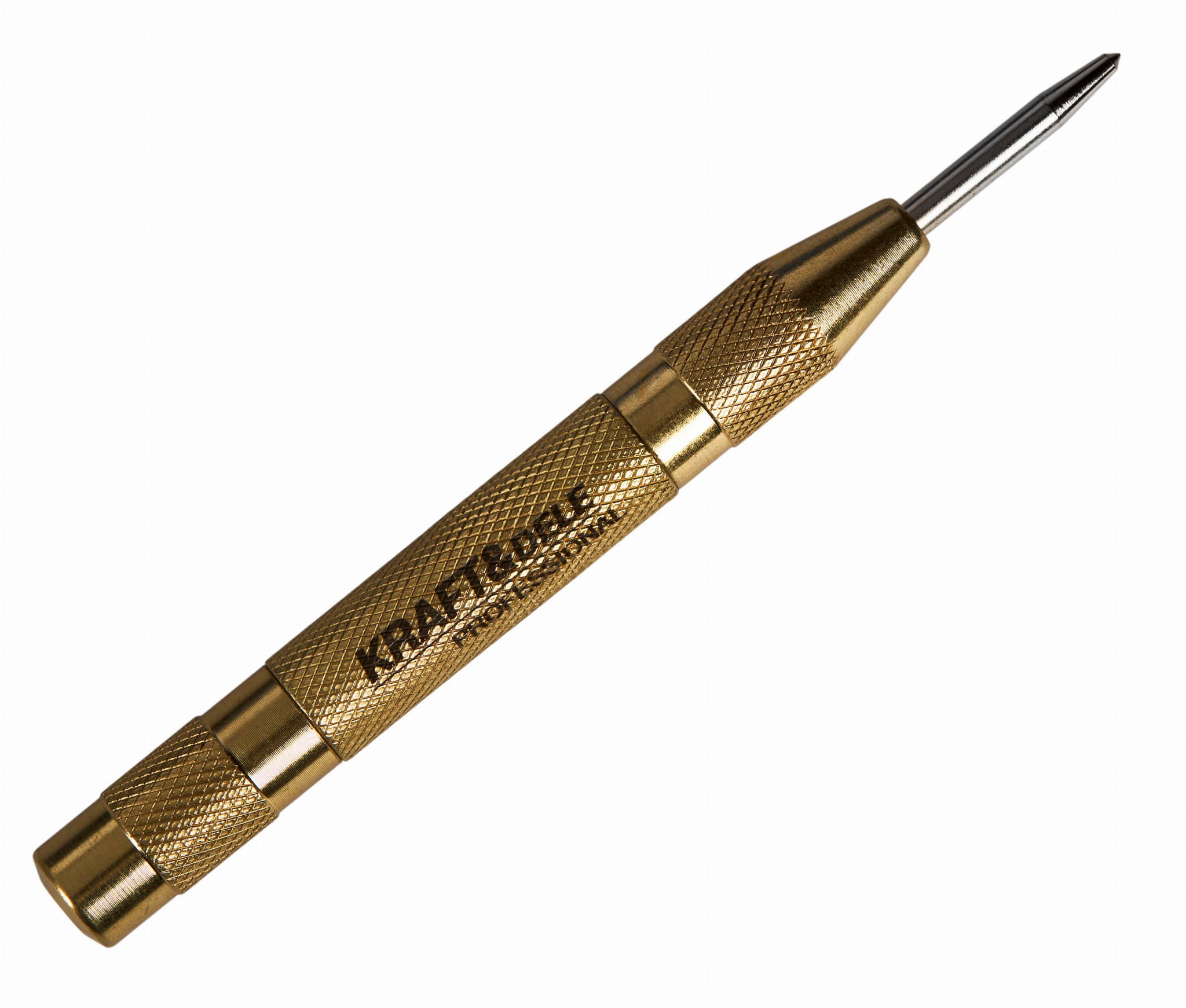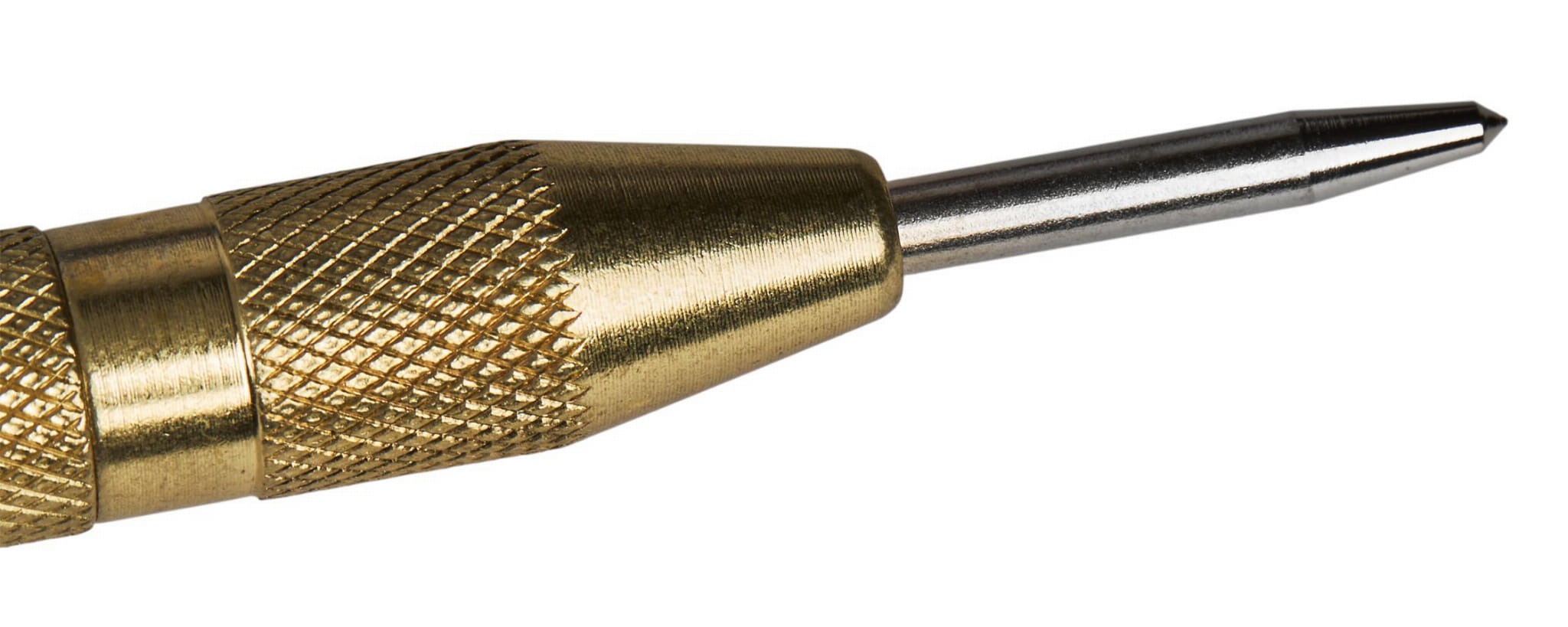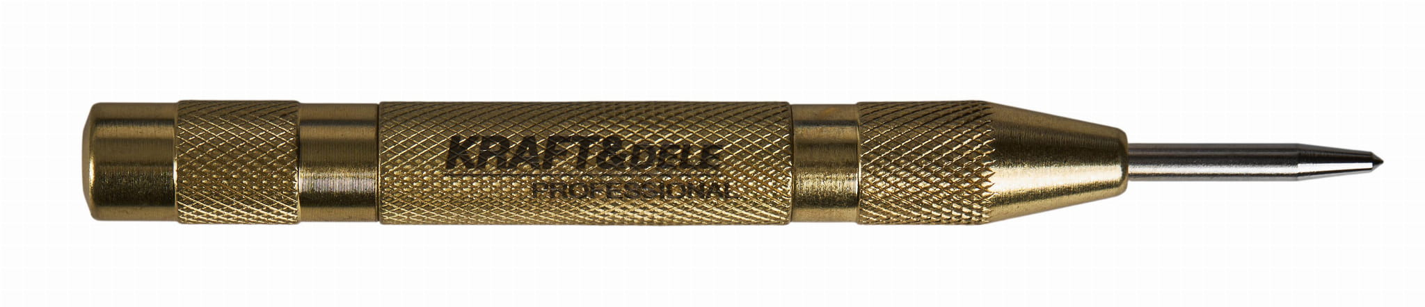 Wewnętrzna sprężyna uderza w iglicę po dociśnięciu narzędzia do materiału. Nie wymaga użycia młotka ani dodatkowej siły — jedno naciśnięcie wystarczy do wykonania punktu centrującego.
