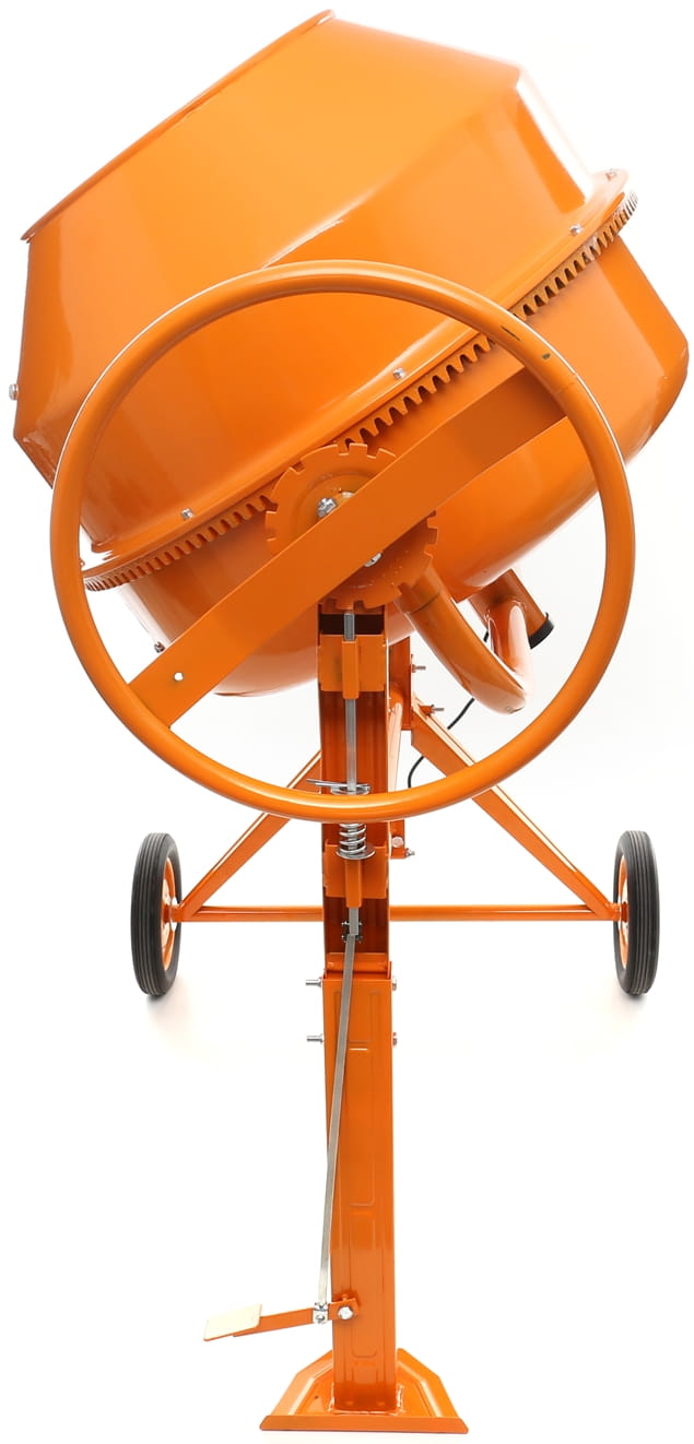 Uszczelka gumowa przy krawędzi bębna zapobiega wyciekaniu rzadszych zapraw podczas mieszania. Koło mechanizmu przechyłu umożliwia precyzyjne ustawienie kąta bębna i wygodne opróżnianie gotowej mieszanki bez konieczności podnoszenia urządzenia.