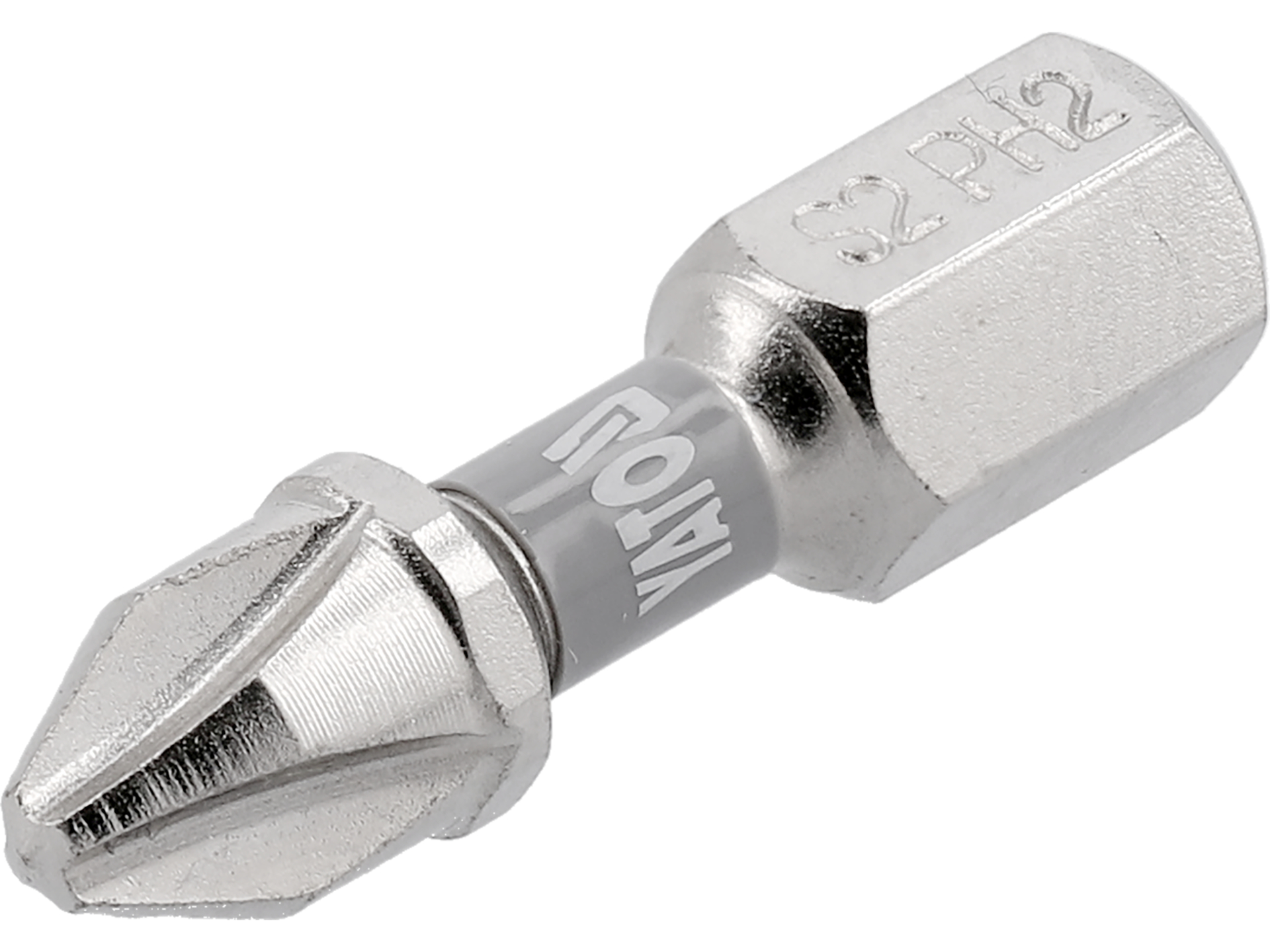 Końcówki wkrętakowe ze stali S2 z grotem Phillips PH2, przeznaczone do wkrętarek i wiertarko-wkrętarek z uchwytem sześciokątnym 1/4". Zestaw zawiera 2 sztuki bitów o długości 25 mm z niklowanym wykończeniem.
