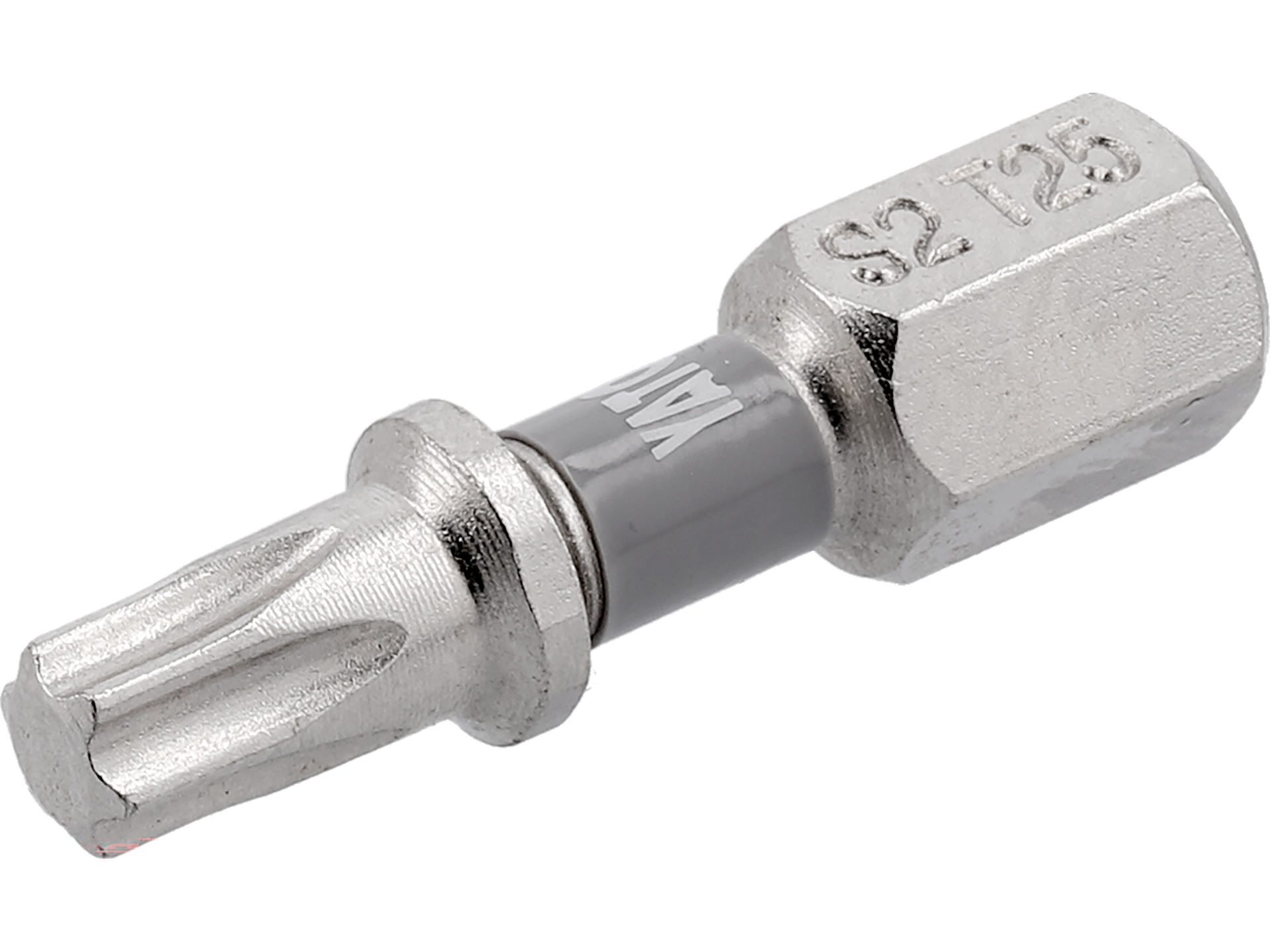 Profesjonalne końcówki wkrętakowe z grotem TORX T25 i uchwytem sześciokątnym 1/4". Zestaw zawiera 2 sztuki bitów o długości 25 mm, wykonanych ze stali narzędziowej S2 z niklowanym wykończeniem.