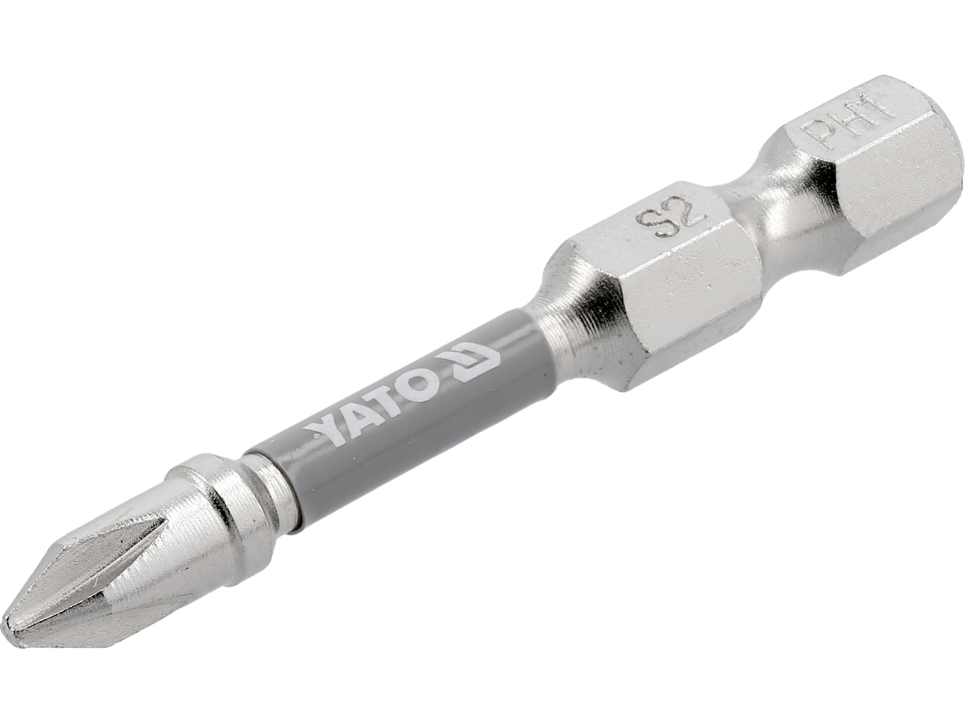 Końcówki wkrętakowe Phillips PH1 ze stali S2 o długości 50 mm, przeznaczone do wkrętarek i wiertarko-wkrętarek z uchwytem sześciokątnym 1/4". Zestaw zawiera 2 sztuki bitów z niklowanym wykończeniem powierzchni.