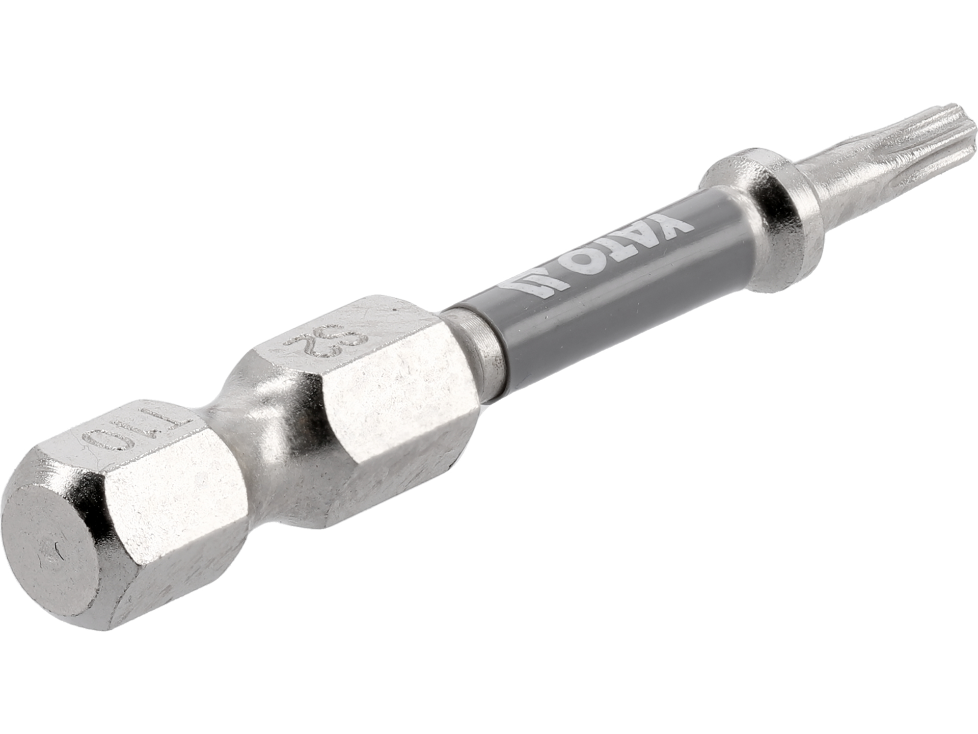 Końcówki wkrętakowe TORX T10 o długości 50 mm z uchwytem sześciokątnym 1/4", wykonane ze stali S2. Zestaw zawiera 2 sztuki bitów z niklowaną powierzchnią, przeznaczonych do pracy z wkrętarkami i wiertarko-wkrętarkami.