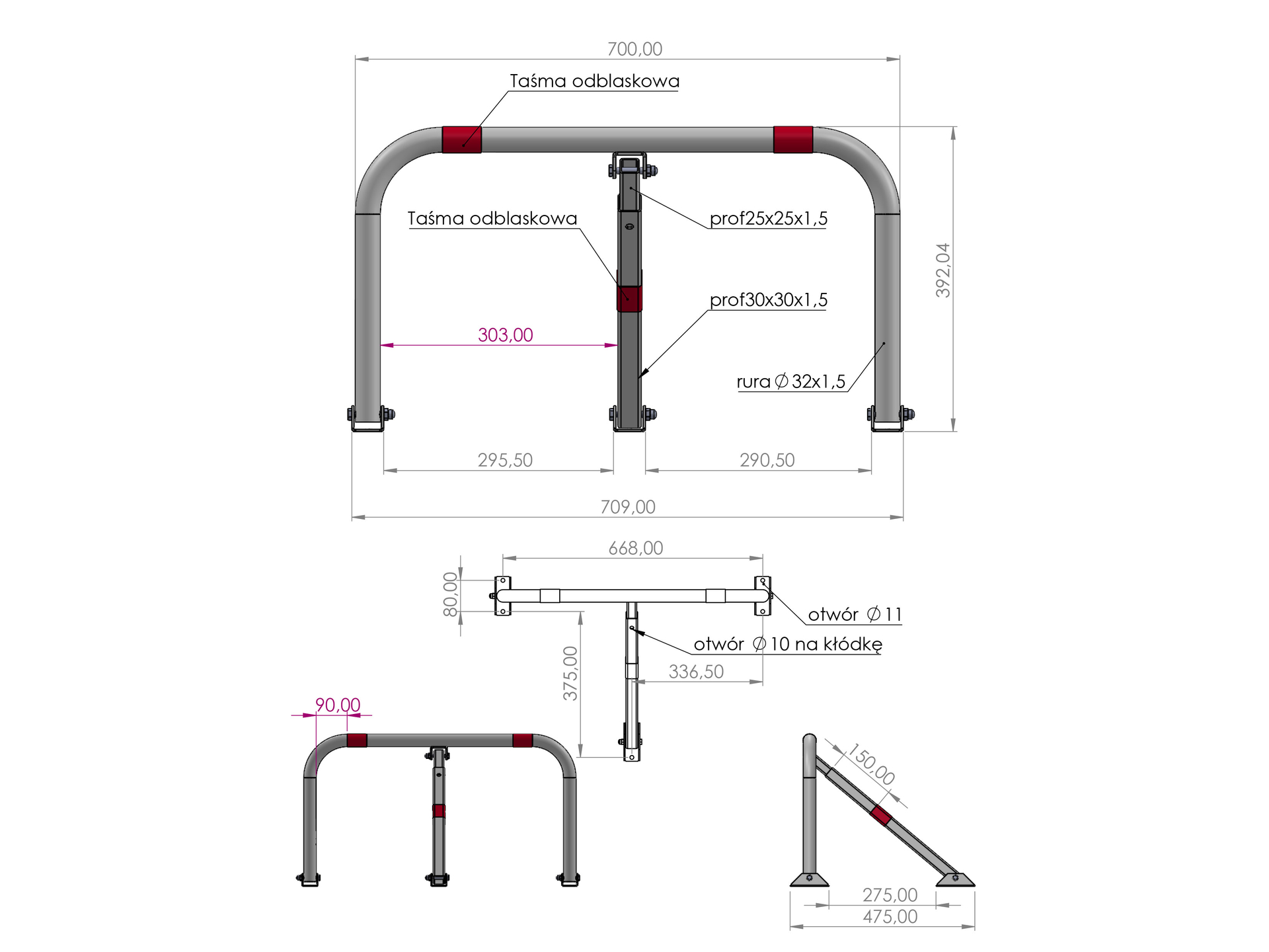 Szerokość 71 cm skutecznie blokuje wjazd pojazdów osobowych i dostawczych, natomiast wysokość 40 cm zapewnia widoczność bariery dla kierowców. Konstrukcja nie zajmuje nadmiernie dużo przestrzeni po złożeniu.