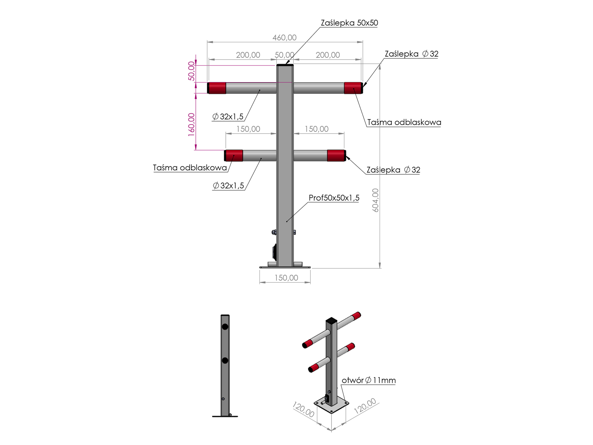 Powłoka proszkowa zapewnia ochronę antykorozyjną i odporność na warunki atmosferyczne. Grubość ścianek rurki 1,3 mm, słupka 1,5 mm oraz blachy podstawy 3 mm gwarantują wytrzymałość mechaniczną i stabilność konstrukcji.