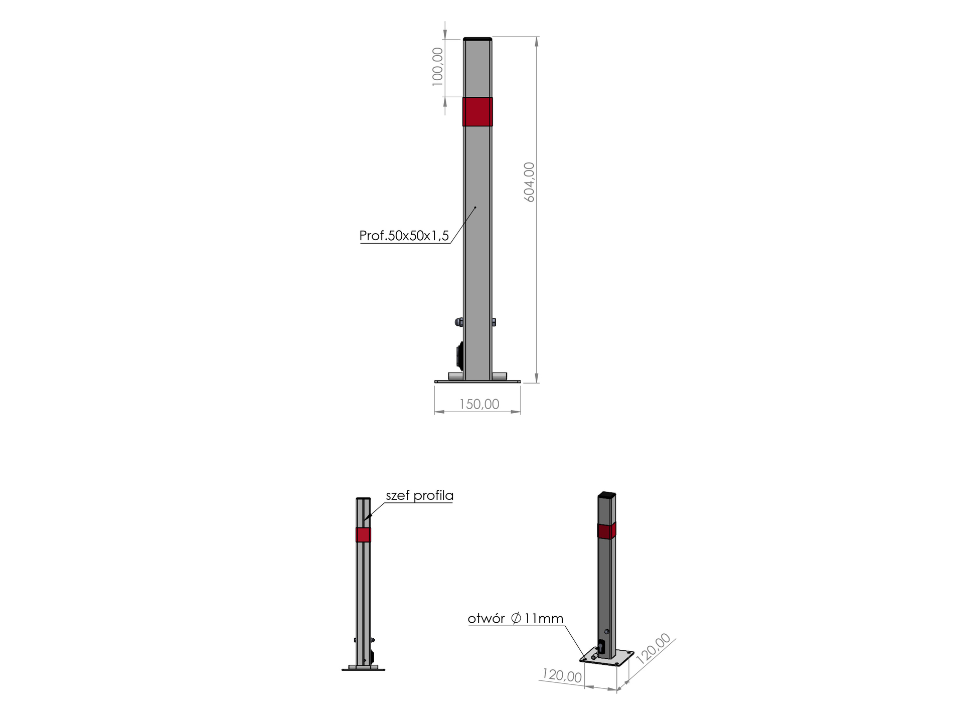 Podstawa 15 × 15 cm z czterema otworami montażowymi o średnicy 11 mm (rozstaw 12 × 12 cm) pozwala na trwałe zakotwienie w betonie, asfalcie lub kostce brukowej. Masa 4,5 kg zapewnia stabilność po zamontowaniu, a wymiary podstawy umożliwiają zastosowanie kotew chemicznych lub mechanicznych.