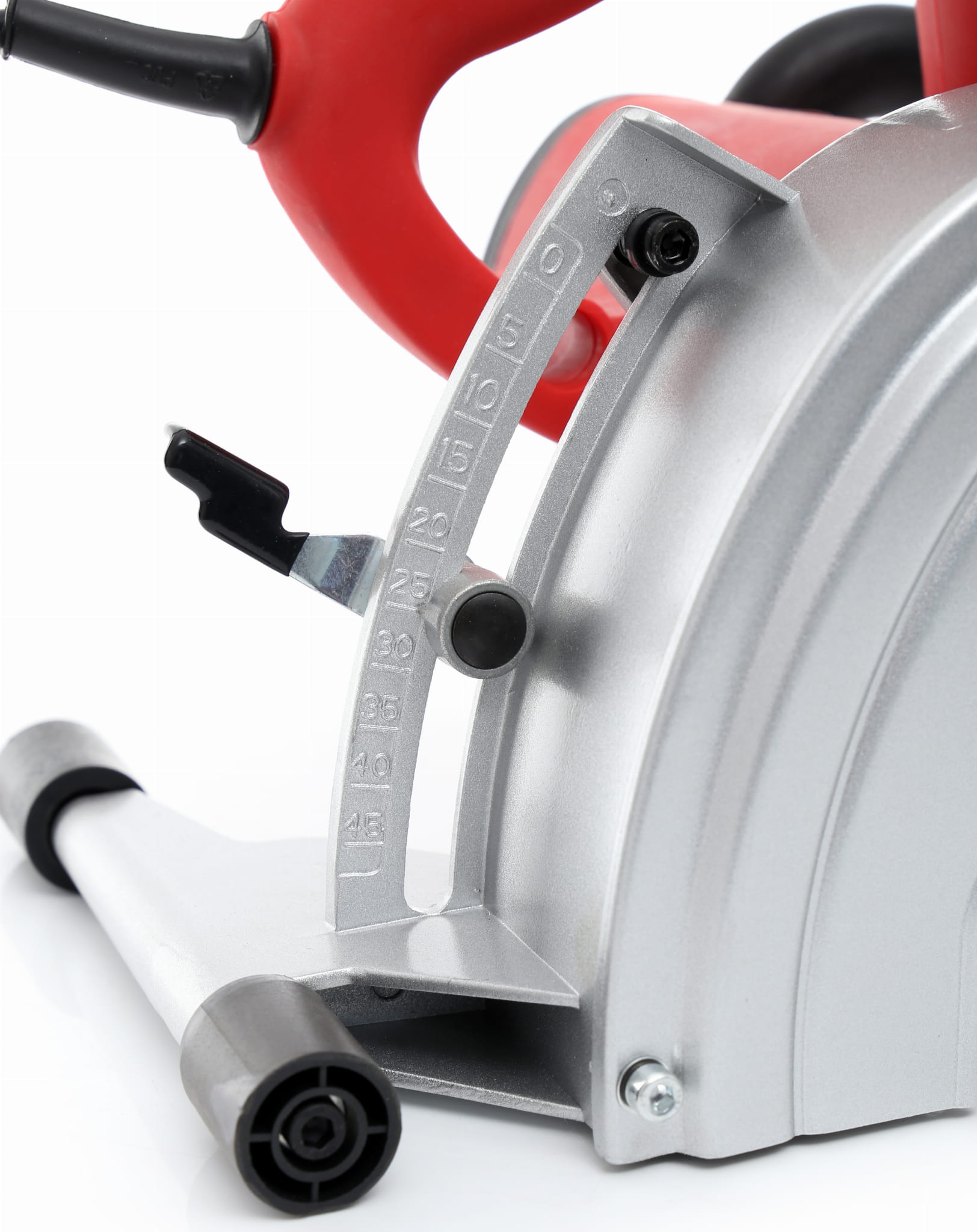 Głębokość nacięcia można ustawiać płynnie w zakresie 0–45 mm, co odpowiada typowym wymaganiom przy prowadzeniu instalacji elektrycznych, wodnych i gazowych. Szerokość bruzdy jest dostępna w czterech konfiguracjach: 14, 24, 34 i 44 mm — wybór zależy od liczby i przekroju prowadzonych przewodów lub rur.