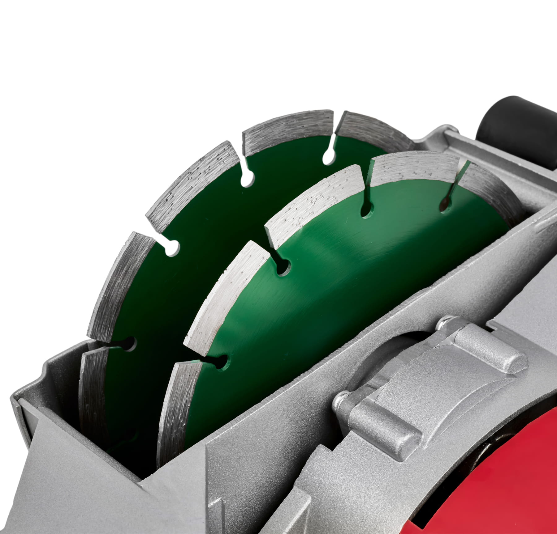 Zastosowanie dwóch tarcz pracujących jednocześnie umożliwia wykonanie bruzdy o zdefiniowanej szerokości w jednym przejściu. Grubość tarczy wynosi 2,4 mm, a otwór montażowy 6 mm — parametry istotne przy doborze tarcz zamiennych lub diamentowych.