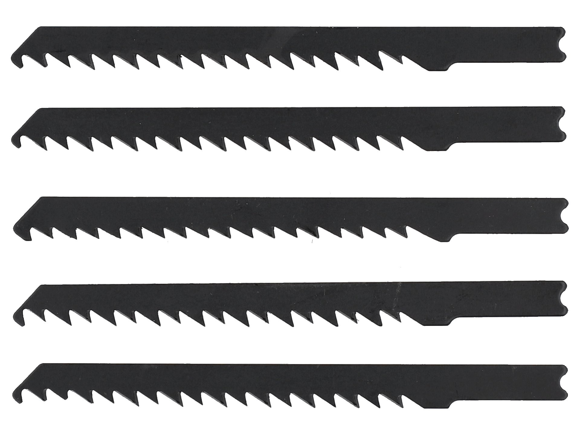 Zestaw pięciu brzeszczotów do wyrzynarki przeznaczonych do cięcia drewna i materiałów drewnopochodnych. Wyposażone w uchwyt typu B&D zapewniający kompatybilność z większością wyrzynarek elektrycznych dostępnych na rynku.