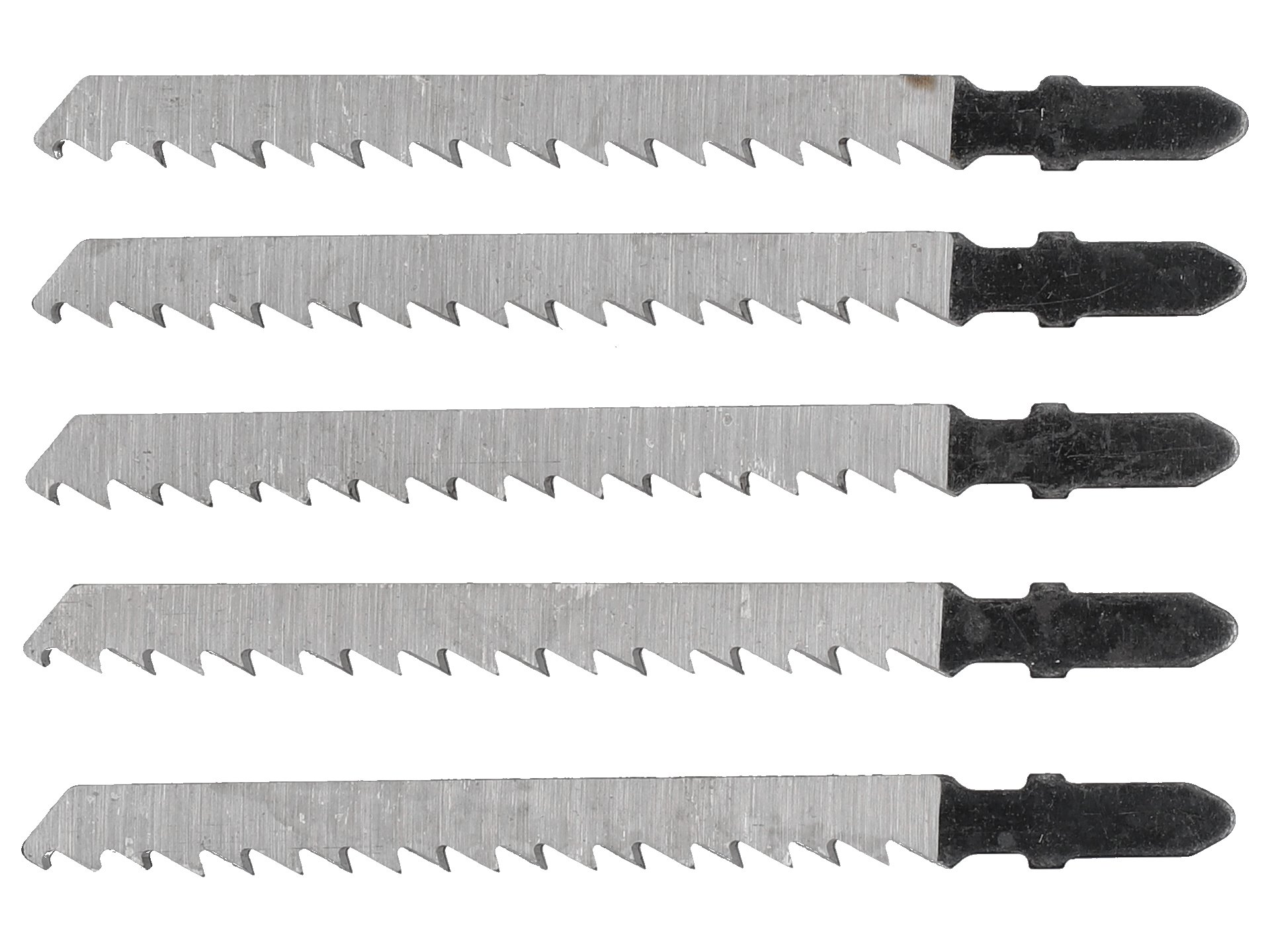 Zestaw pięciu brzeszczotów do wyrzynarki przeznaczonych do cięcia drewna i tworzyw sztucznych. Kompatybilne z uchwytem typu Bosch - najpopularniejszym standardem montażu w wyrzynarkach elektrycznych.