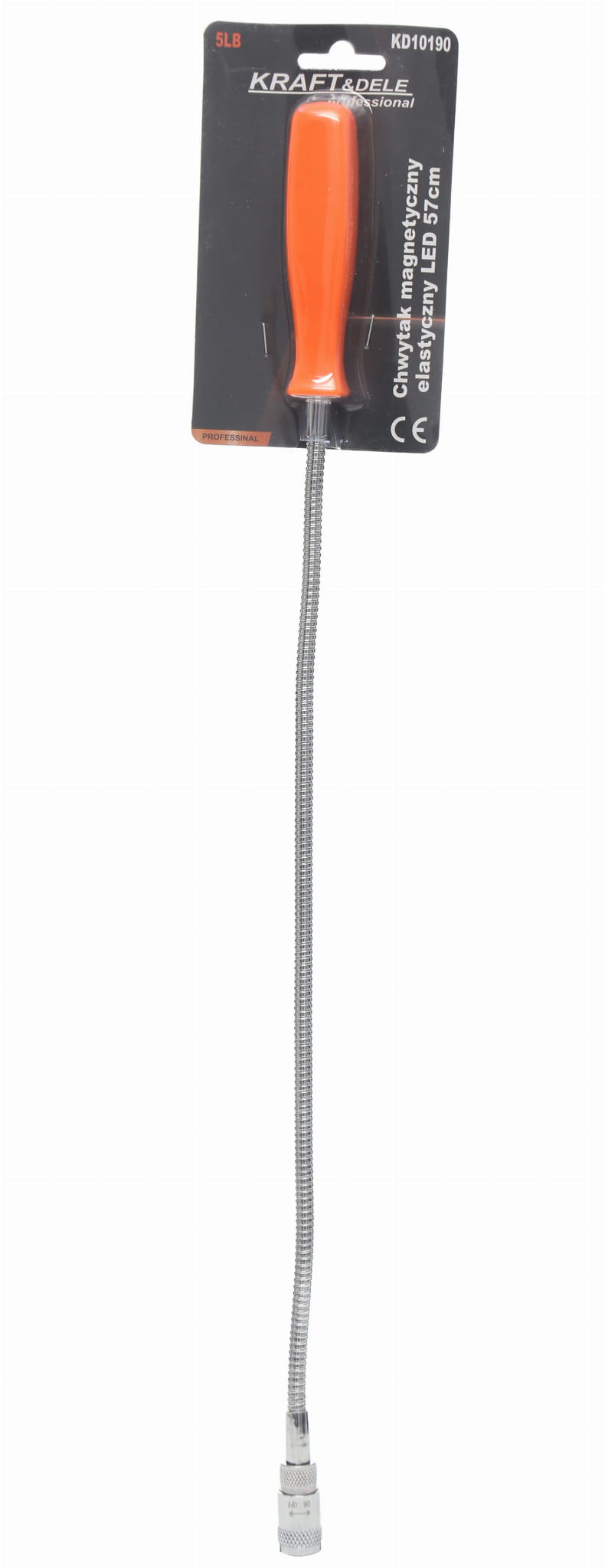 Giętki chwytak magnetyczny z diodą LED przeznaczony do wyciągania drobnych metalowych elementów z trudno dostępnych miejsc. Elastyczna konstrukcja o długości 57 cm umożliwia prowadzenie końcówki po łuku, co sprawdza się w ciasnych przestrzeniach, wnękach silnikowych i przy pracach instalacyjnych.