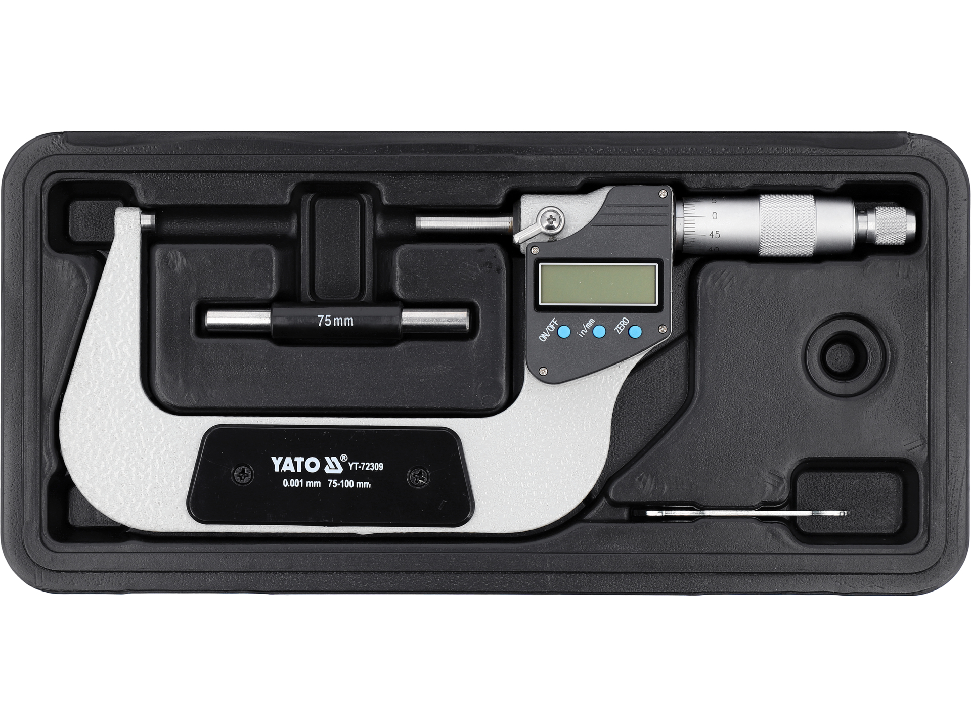 Precyzyjny przyrząd pomiarowy do określania wymiarów zewnętrznych elementów mechanicznych w zakresie 75-100 mm. Mikrometr cyfrowy z wyświetlaczem LCD umożliwia pomiary z rozdzielczością 0,001 mm i dokładnością ±0,002 mm, zapewniając powtarzalne wyniki w warunkach warsztatowych i laboratoryjnych.