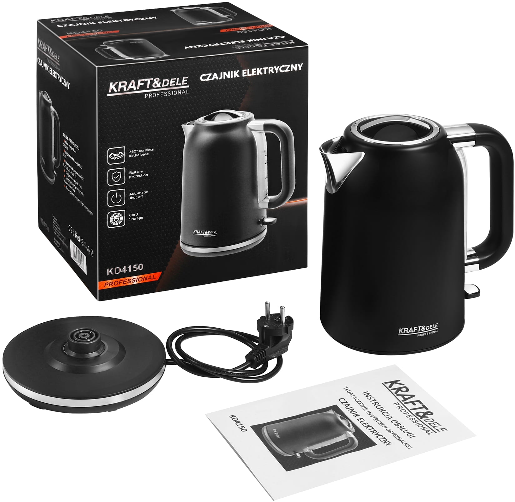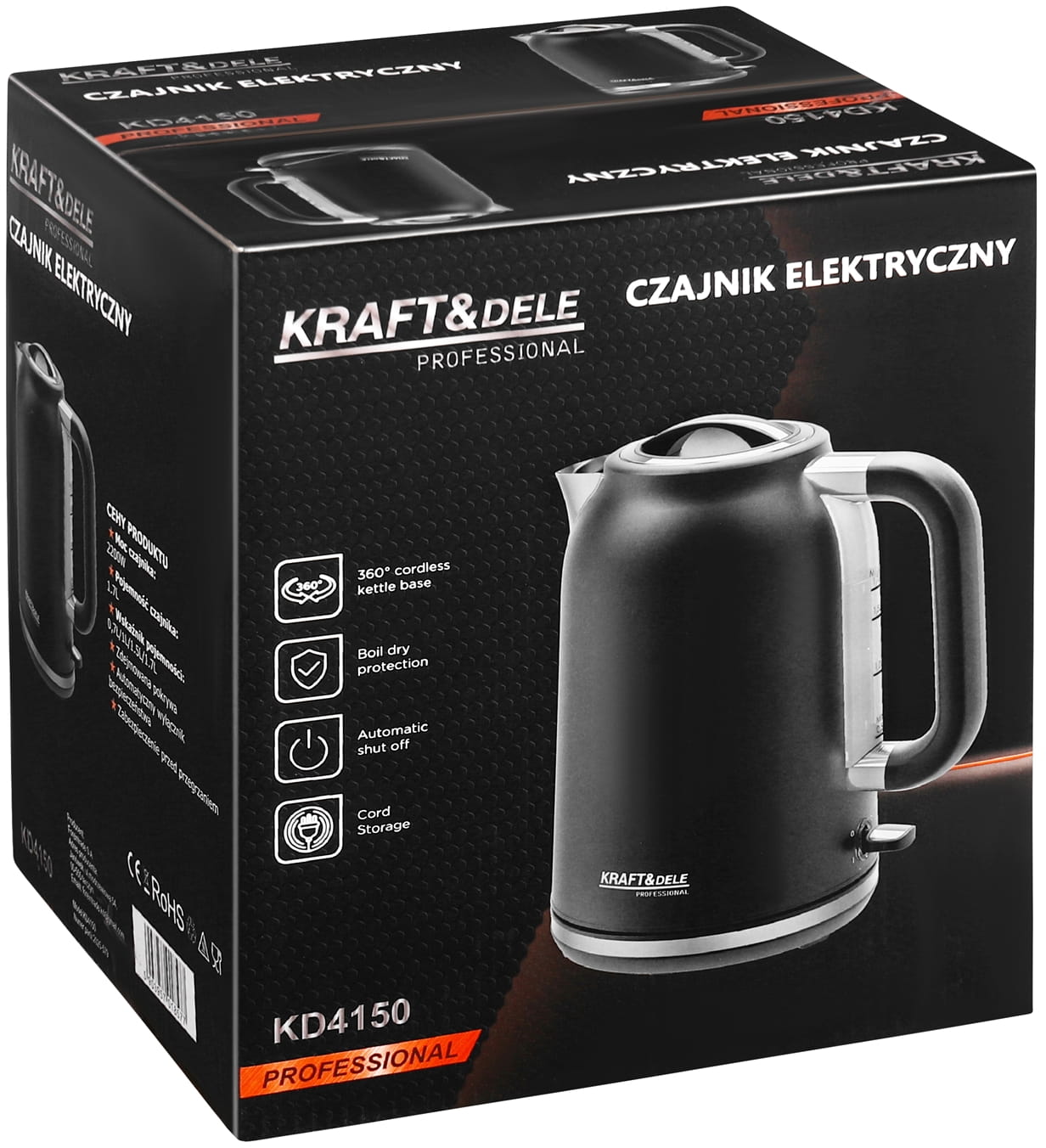 KD4150 to czajnik elektryczny z grzałką o mocy 2200W, przeznaczony do użytku domowego i biurowego. Urządzenie wyposażono w zabezpieczenie Boil Dry Protection, automatyczny wyłącznik oraz obrotową podstawę 360°, co przekłada się na bezpieczną i wygodną eksploatację.