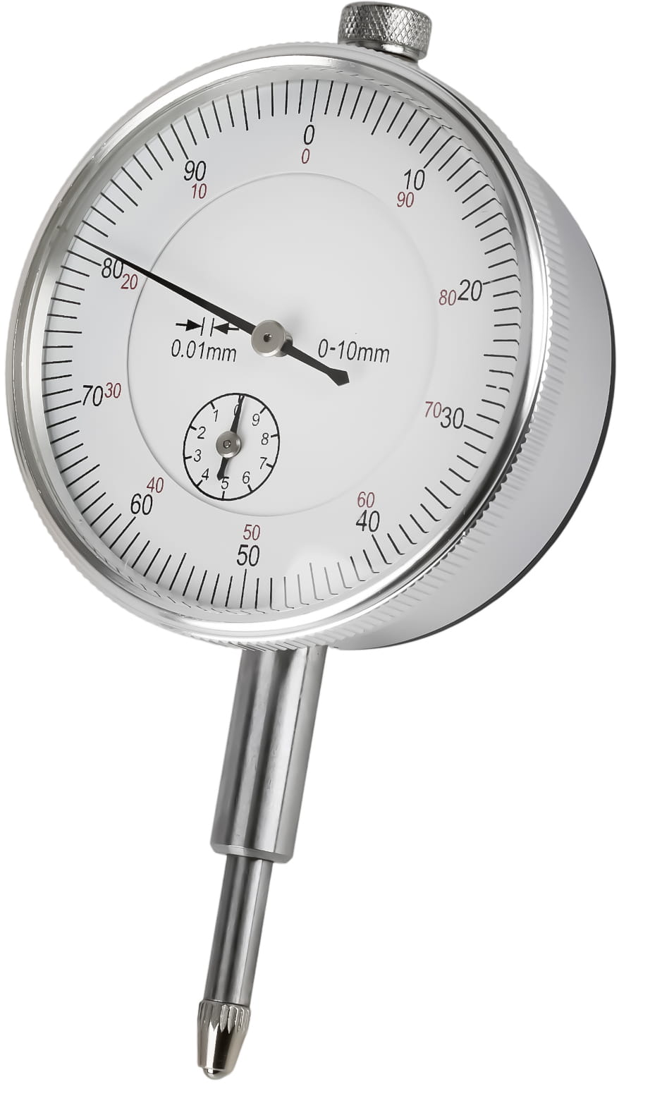 Działka elementarna 0,01 mm (10 µm) umożliwia wykrycie odchyłek istotnych przy kontroli bicia wałów, tarcz i kół pasowych. Czytelna tarcza wskaźnika z wyraźną podziałką ogranicza ryzyko błędu odczytu podczas pracy.