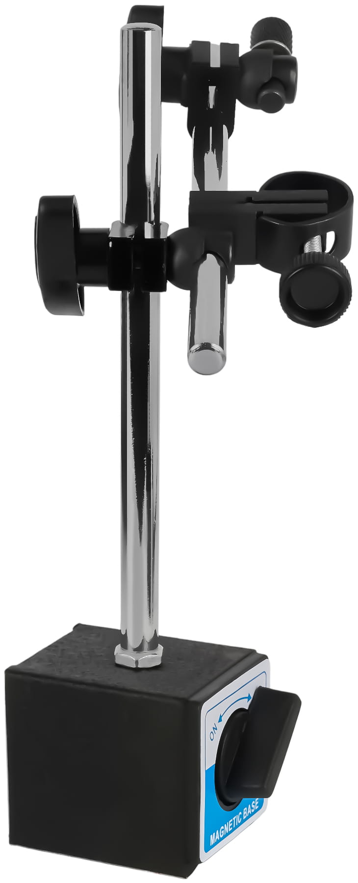 Magnes stały mocowany do stalowych powierzchni — stołów pomiarowych, bloków silnika, tarcz hamulcowych — bez konieczności użycia dodatkowych uchwytów. Przełącznik ON/OFF pozwala na szybkie repozycjonowanie statywu bez utraty ustawień czujnika.