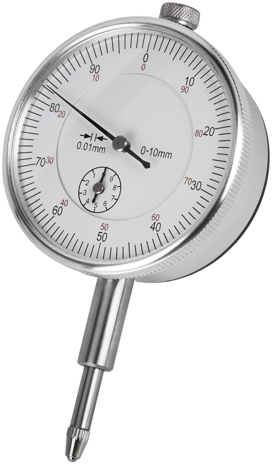 Działka elementarna 0,01 mm oznacza, że każde pełne obrócenie wskazówki odpowiada 1 mm przemieszczenia trzpienia. Zakres 10 mm pozwala na pomiar zarówno niewielkich odchyleń, jak i większych przemieszczeń — bez konieczności zmiany narzędzia. Trzpień o średnicy Ø 8 mm jest standardowym wymiarem zgodnym z uchwytami statywów pomiarowych.