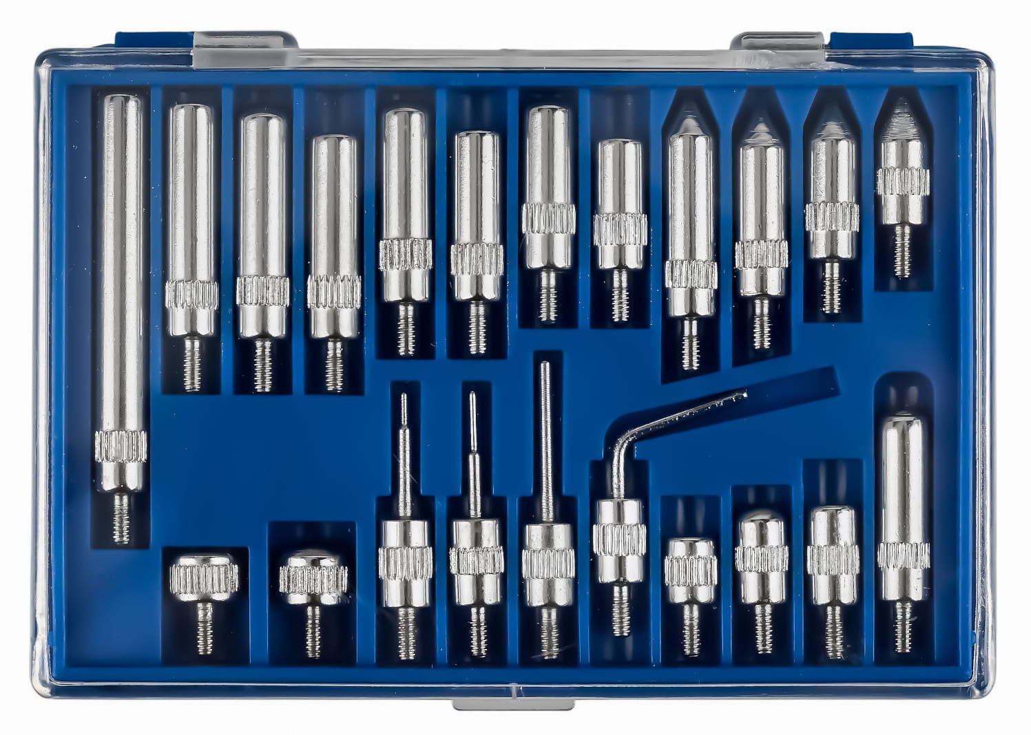 | Typy końcówek | 8 gładkich, 4 zaokrąglone, 4 stożkowe, 3 igły proste, 1 igła gięta, 2 z kuleczką |