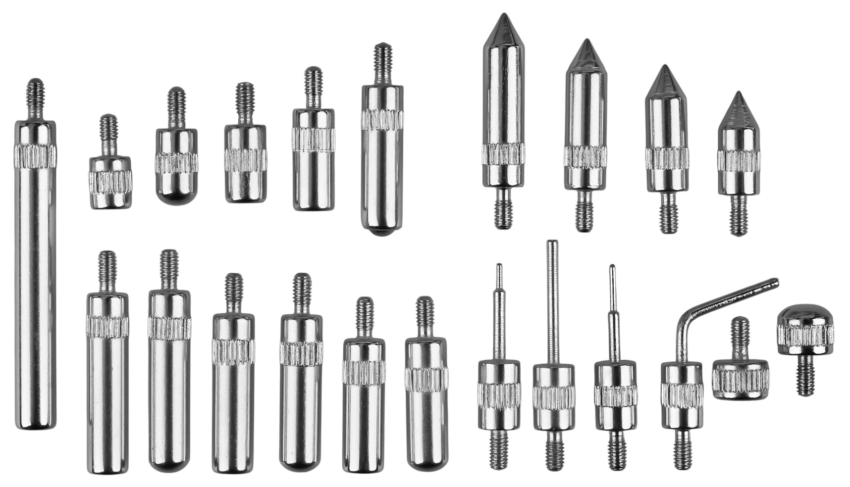 Zestaw zawiera 8 końcówek gładkich (cylindrycznych), 4 zaokrąglone, 4 stożkowe, 3 igły proste, 1 igłę giętą oraz 2 końcówki z kuleczką. Każda geometria służy innym zastosowaniom: igły i końcówki stożkowe umożliwiają dotarcie do wąskich rowków i trudno dostępnych powierzchni, zaokrąglone nadają się do pomiaru na powierzchniach krzywoliniowych, a kuleczkowe — do pomiaru w otworach.