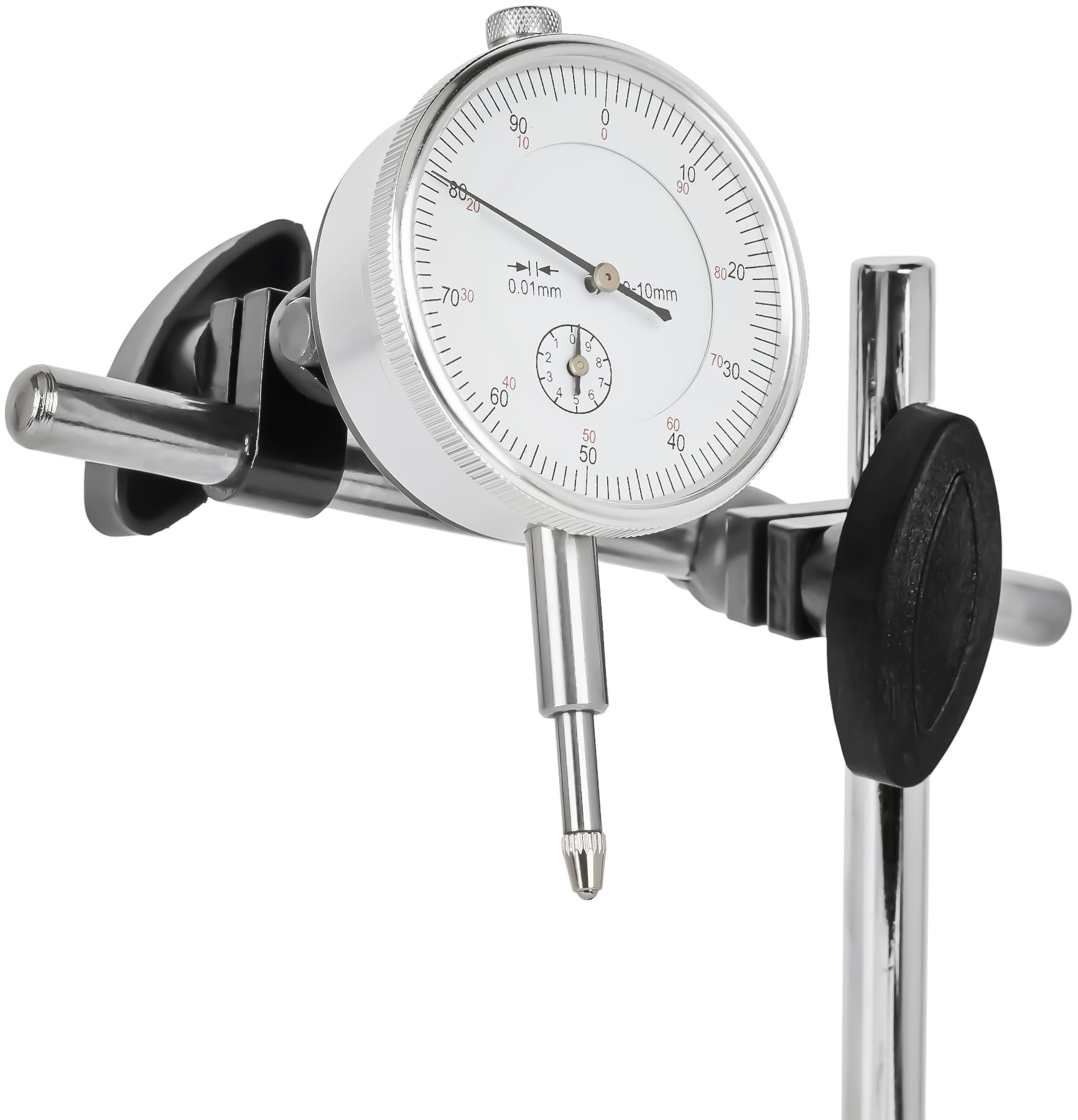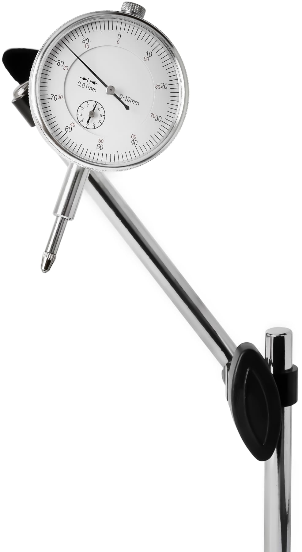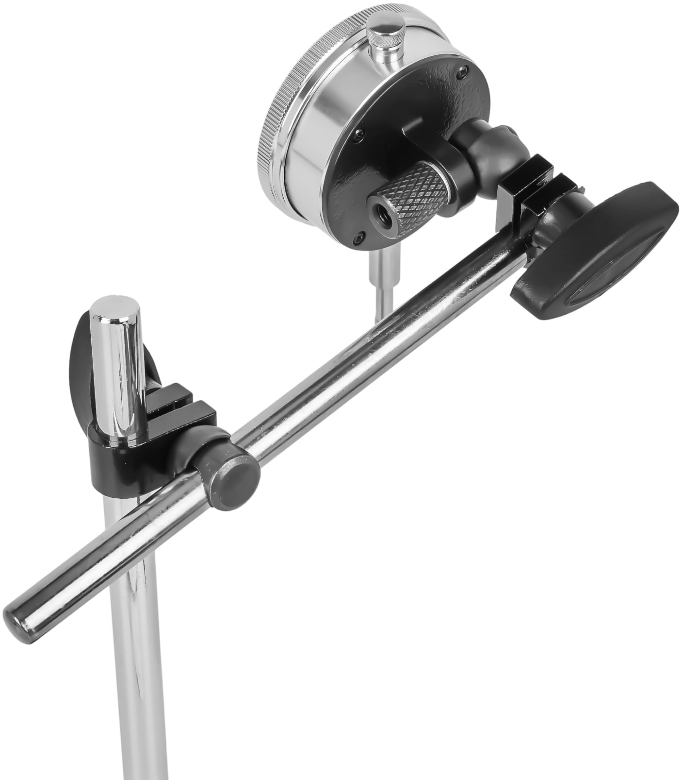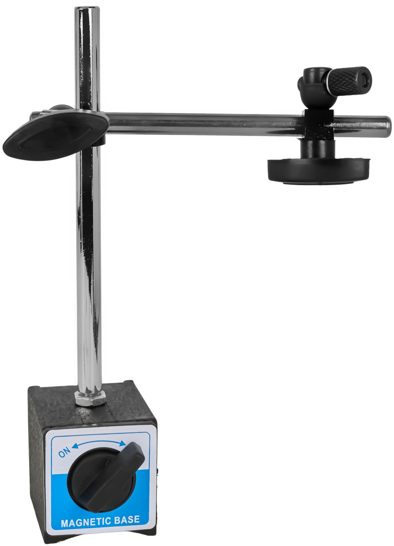 Magnetyczna podstawa przytwierdza statyw do stalowych powierzchni — stołów warsztatowych, korpusów maszyn, tarcz hamulcowych czy belek pomiarowych — bez konieczności stosowania dodatkowych uchwytów. Przegubowe ramię umożliwia ustawienie czujnika pod dowolnym kątem i na różnych wysokościach, co jest niezbędne przy pomiarach elementów o nieregularnym kształcie.