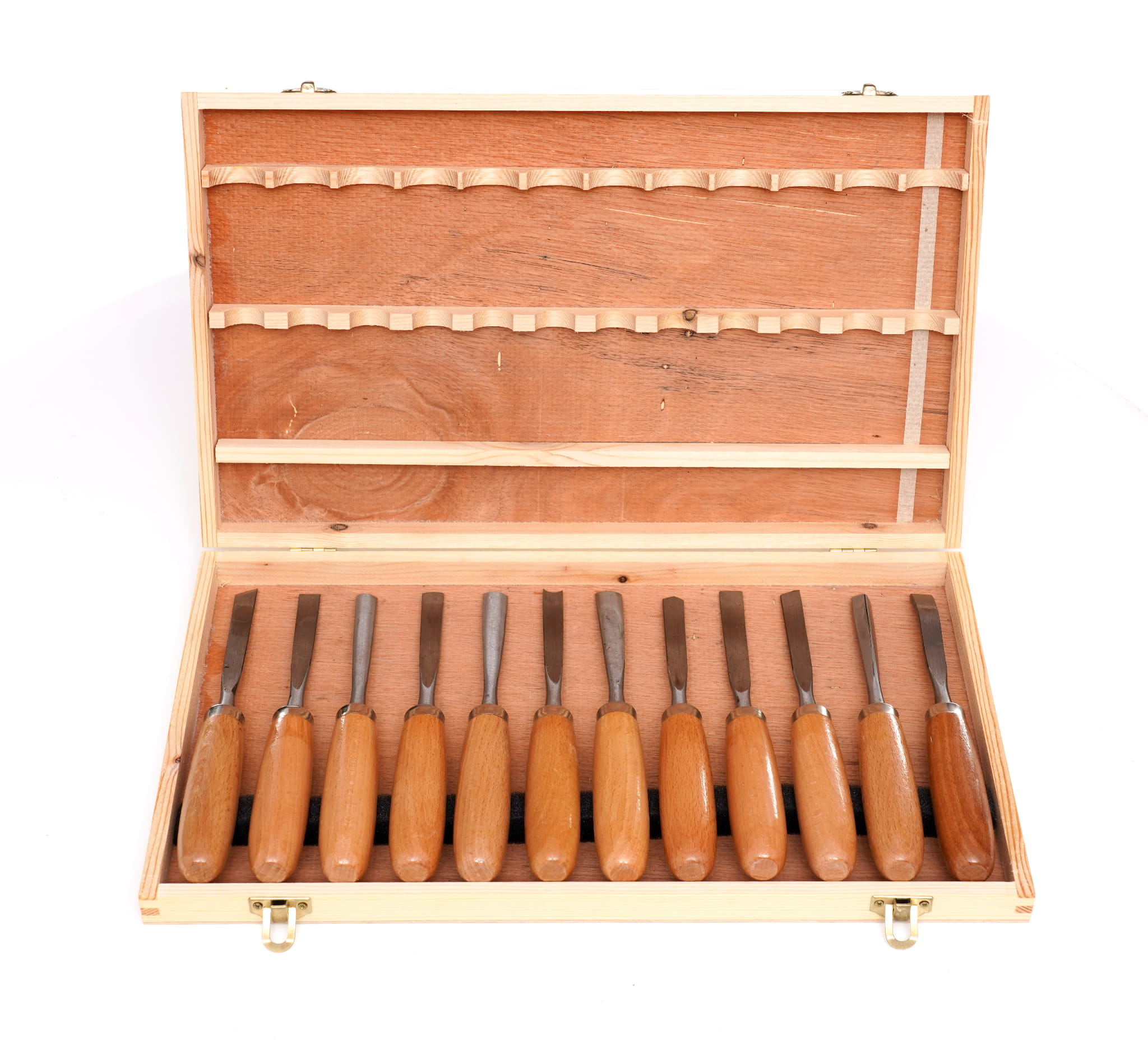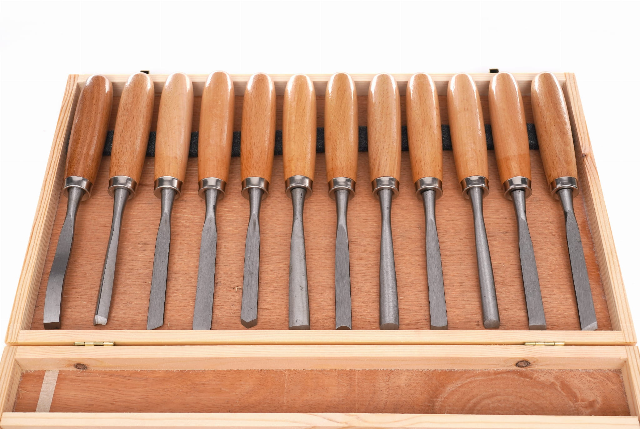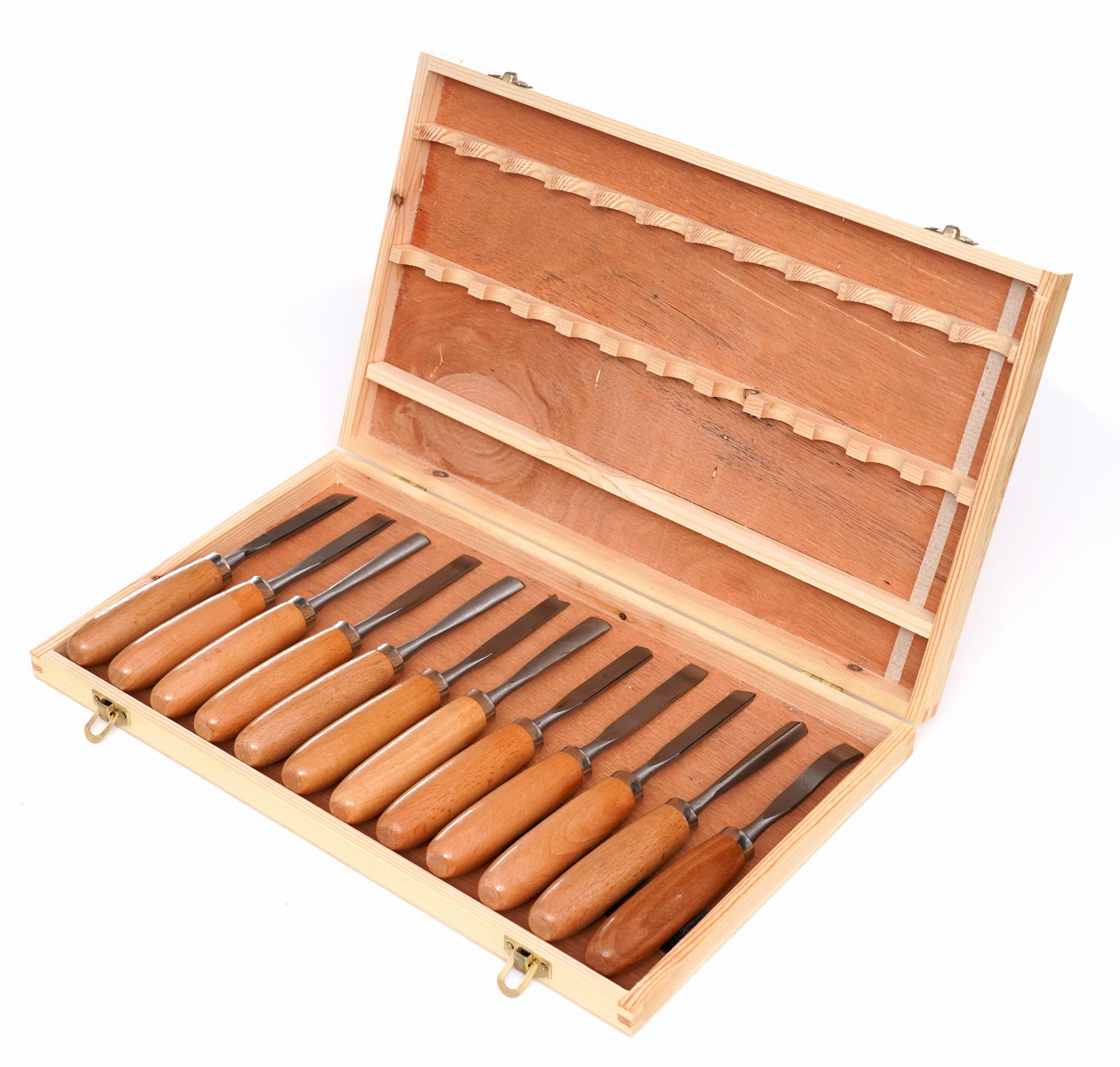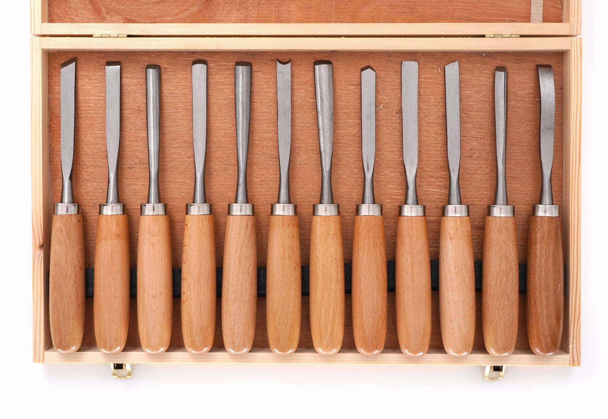 Zestaw 12 dłut do rzeźbienia i obróbki drewna, obejmujący cztery typy ostrzy: płaskie, żłobaki, wygięte i skośne. Narzędzia przeznaczone do ręcznej pracy w drewnie — od precyzyjnego wycinania detali po wykonywanie rowków i otworów. Zestaw przechowywany w drewnianej kasecie.