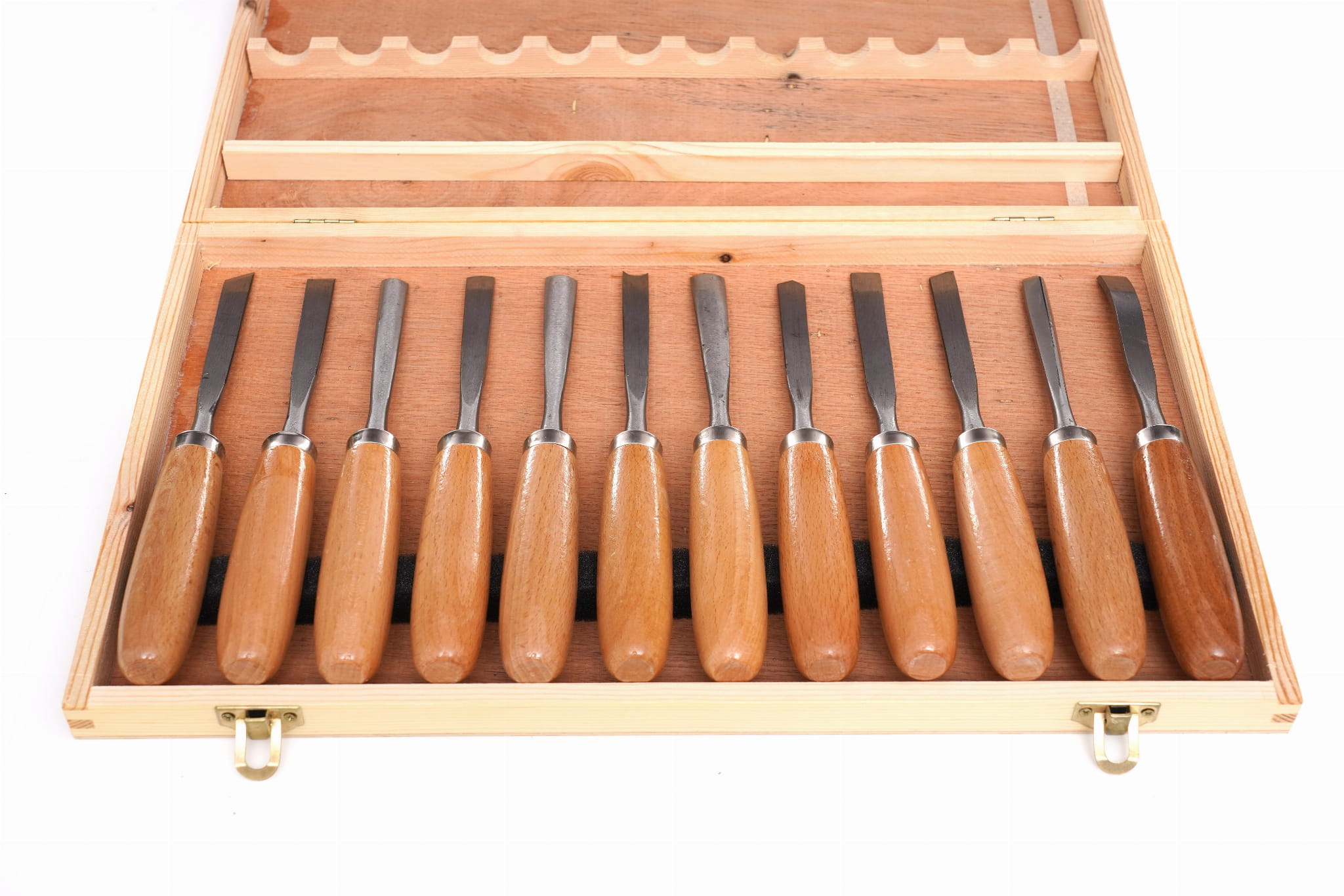 Wszystkie 12 dłut mieści się w dedykowanej drewnianej kasecie, która chroni ostrza przed uszkodzeniem i ułatwia organizację narzędzi w warsztacie. Kaseta pozwala na szybki dostęp do konkretnego typu dłuta bez przeszukiwania skrzynki narzędziowej.