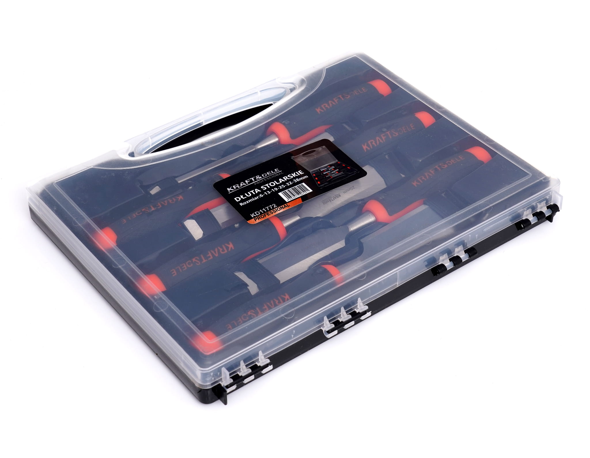 Zestaw dostarczany jest w walizce z dedykowanymi miejscami na poszczególne dłuta. Chroni ostrza przed uszkodzeniem podczas transportu i ułatwia przechowywanie narzędzi na stanowisku pracy.