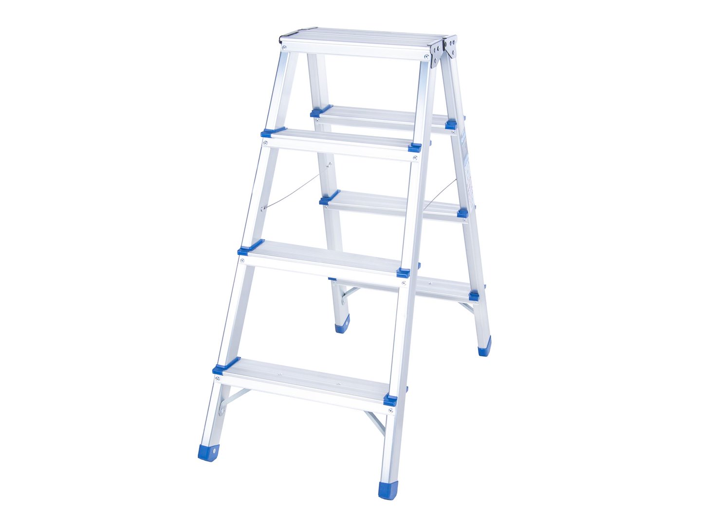Czterostopniowa drabina rozstawna z aluminium, przystosowana do pracy z obu stron. Konstrukcja dwustronna umożliwia wejście z dowolnej strony bez konieczności przestawiania drabiny, co skraca czas wykonywania prac na wysokości do około 2,41 m. Nośność 150 kg i waga zaledwie 2,8 kg sprawiają, że sprawdza się zarówno w zastosowaniach domowych, jak i warsztatowych.