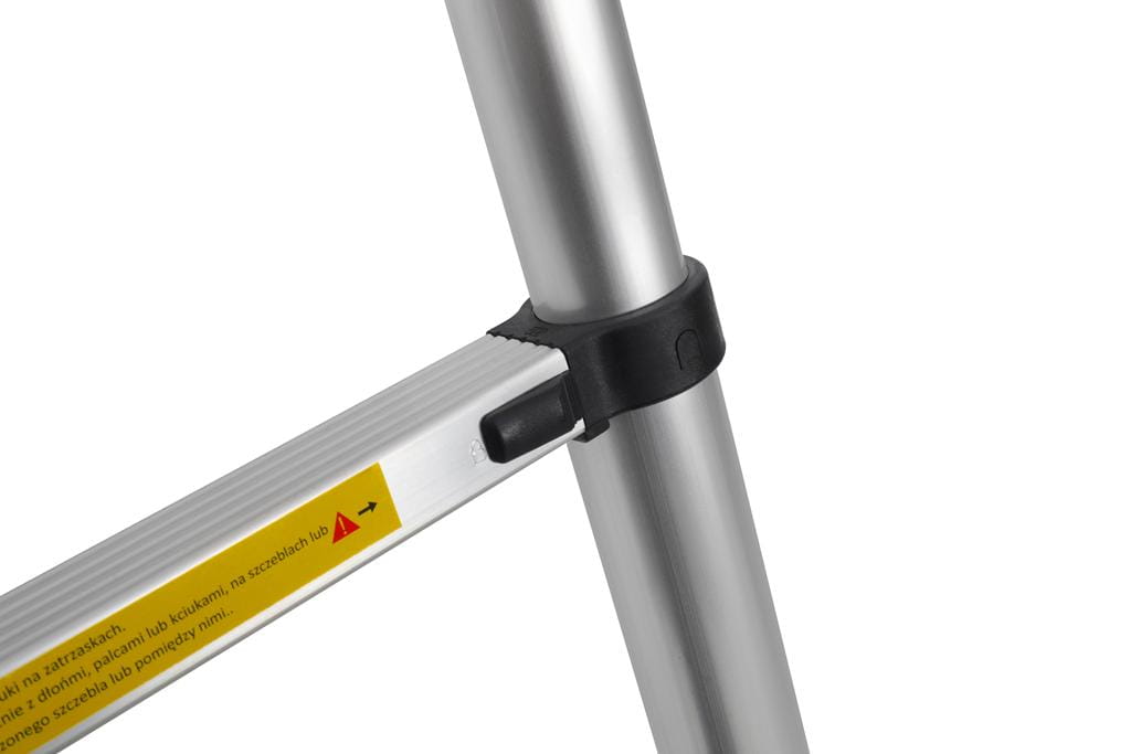 Po złożeniu drabina zajmuje niewielką przestrzeń, co ułatwia przechowywanie w szafie, garażu lub piwnicy. Przeguby blokujące utrzymują drabinę w pozycji rozłożonej podczas użytkowania.