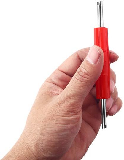 Mały, dwustronny klucz do wentyli łatwo zmieścić w skrzynce narzędziowej i użyć od razu przy pracy z wentylem.